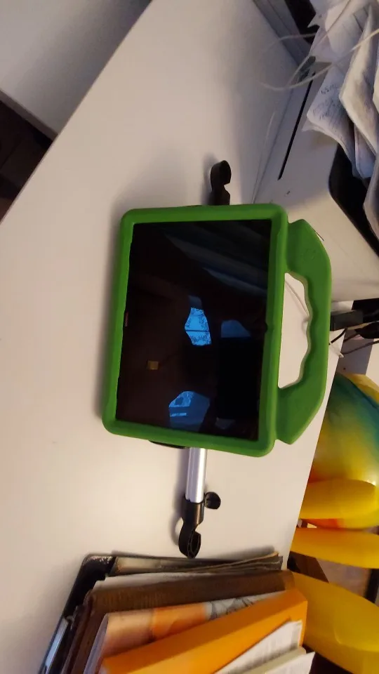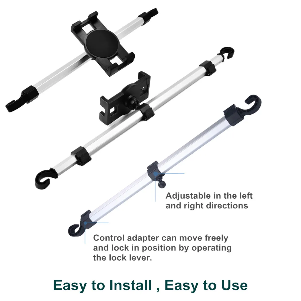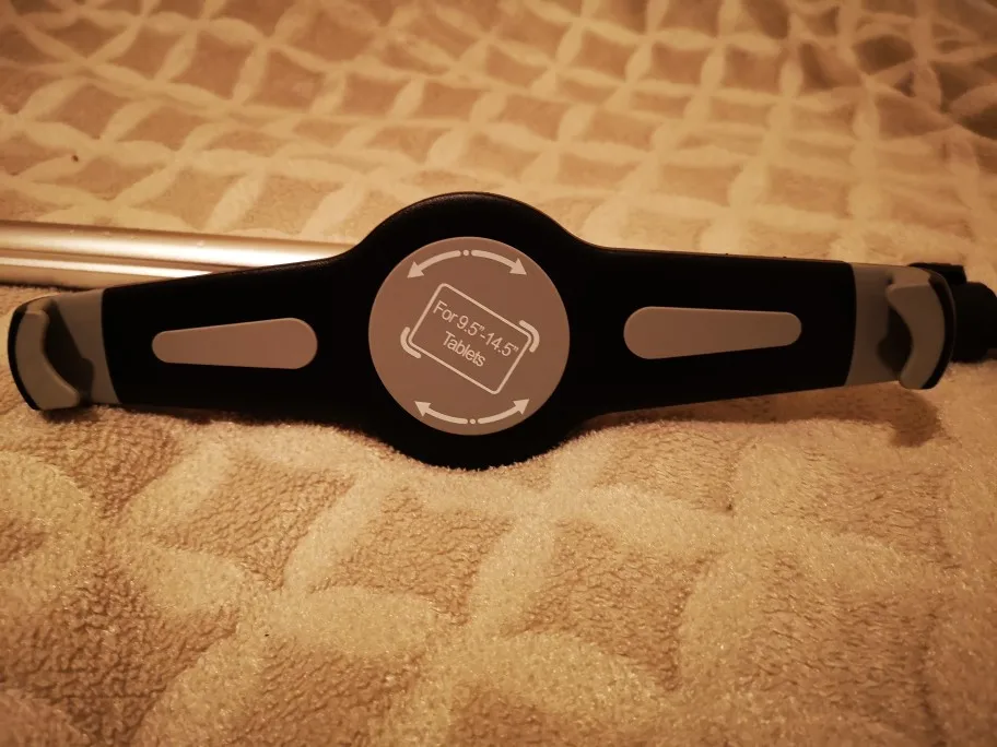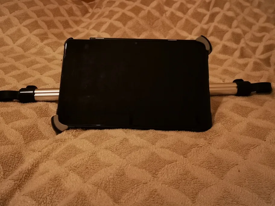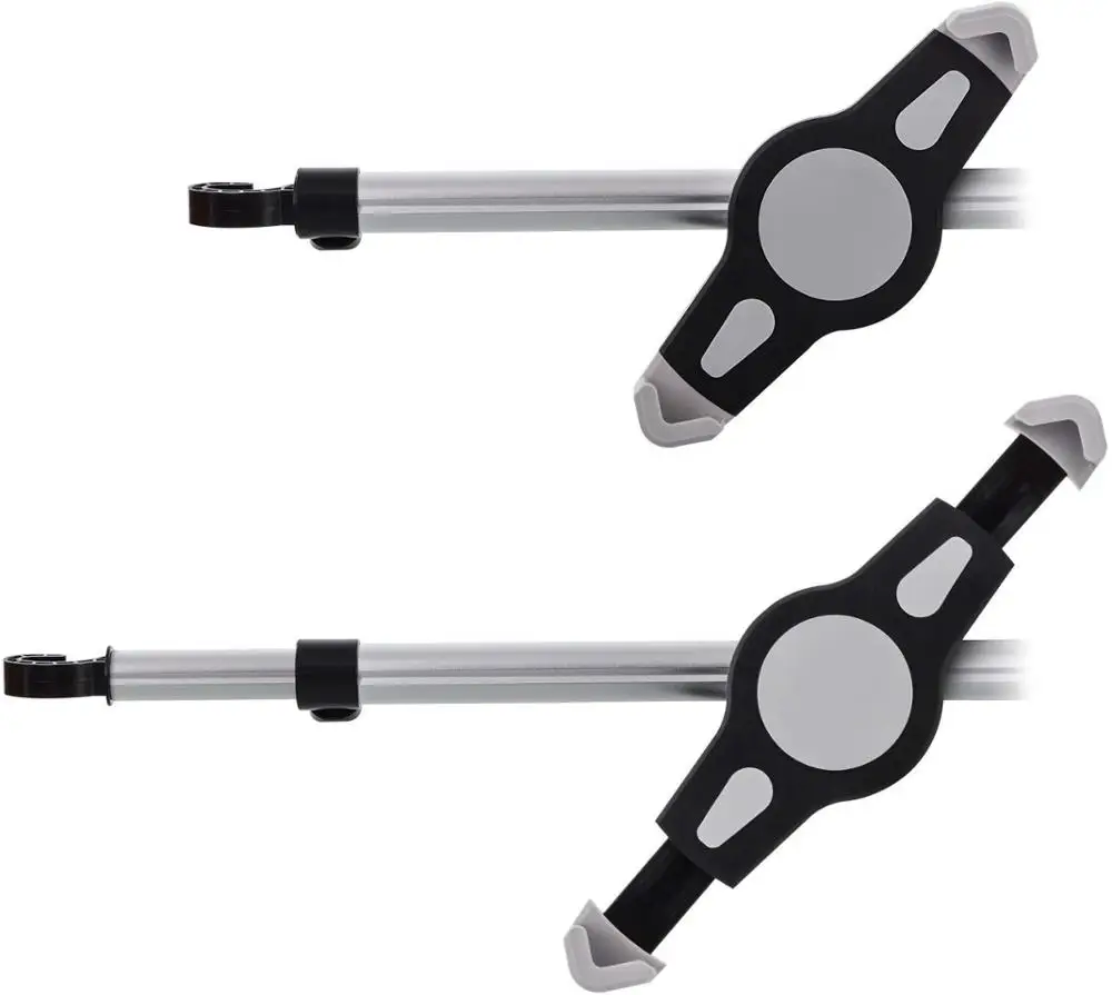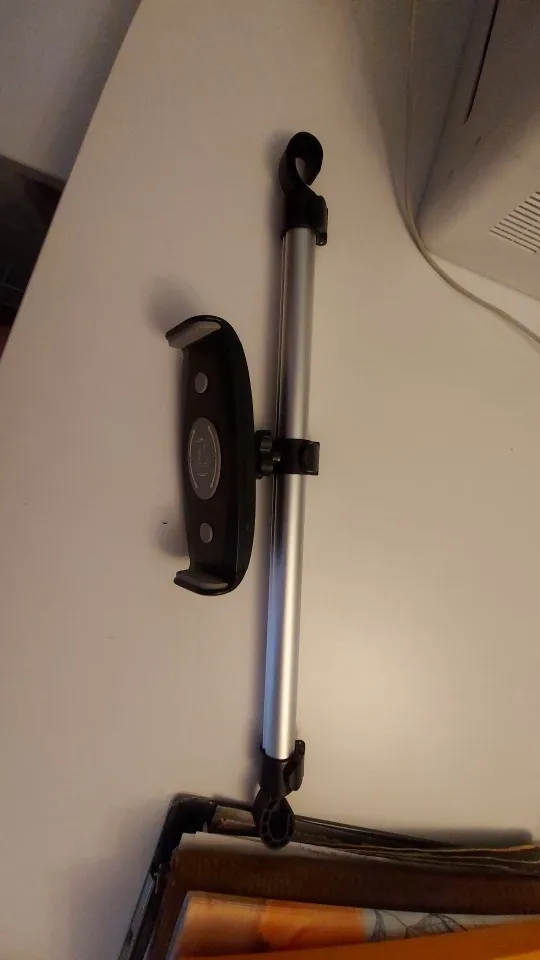Очень хороший продукт, я искал один в течение длительного времени. Бар удерживается между передними опорами головы, и планшет наклоняется по центру через телескопическую руку. У меня есть планшет бренда chuwi, который довольно тяжелый и очень хорошо держится, он не двигается. Большое спасибо, мои дети любят ходить по дороге, глядя на планшет.
