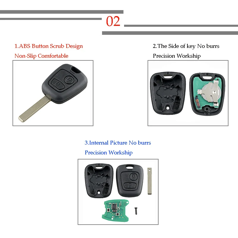 Тип: умный дистанционный Автомобильный ключКнопка: 2 кнопкиЧип: PCF7961/ID46 чипЧастота: 434 МГцМонтажная плата: сЛезвие: сАккумулятор: сСовместимость:Для Citroen C1 C2 C3 C4 Saxo Picasso Xsara Berlingo 2003-2009Для Peugeot 106 206 306 307 107 207 407 2003-2009Важное примечание:1. Пожалуйста, подтвердите, что ваш оригинальный ключ имеет тот же внешний вид, чип и частоту с нашим продуктом, спасибо ~2. Вам нужно пойти в местный дилер или слесарный магазин, чтобы вырезать ключ и программы для вашего автомобиля, слесарь должен взимать меньше, чем дилер.3. Пожалуйста, убедитесь, что ваш ключ точно такой же, как у нас, если вы не уверены, пожалуйста, отправьте нам ваш оригинальный ключ для подтверждения, мы поможем вам купить правильный ключ.Посылка включает в себя: 1 шт. * пульт дистанционного управления