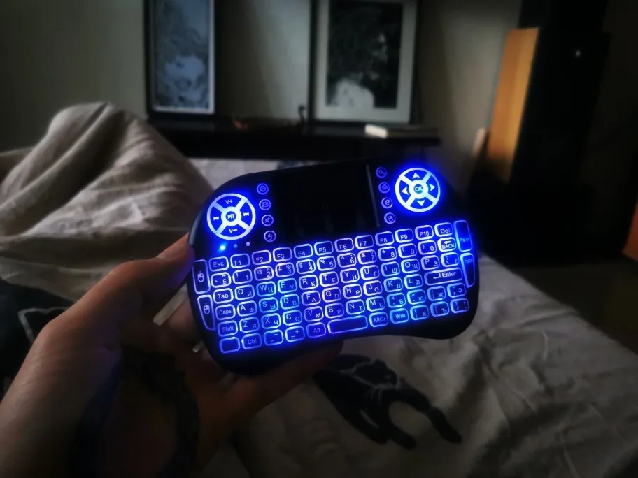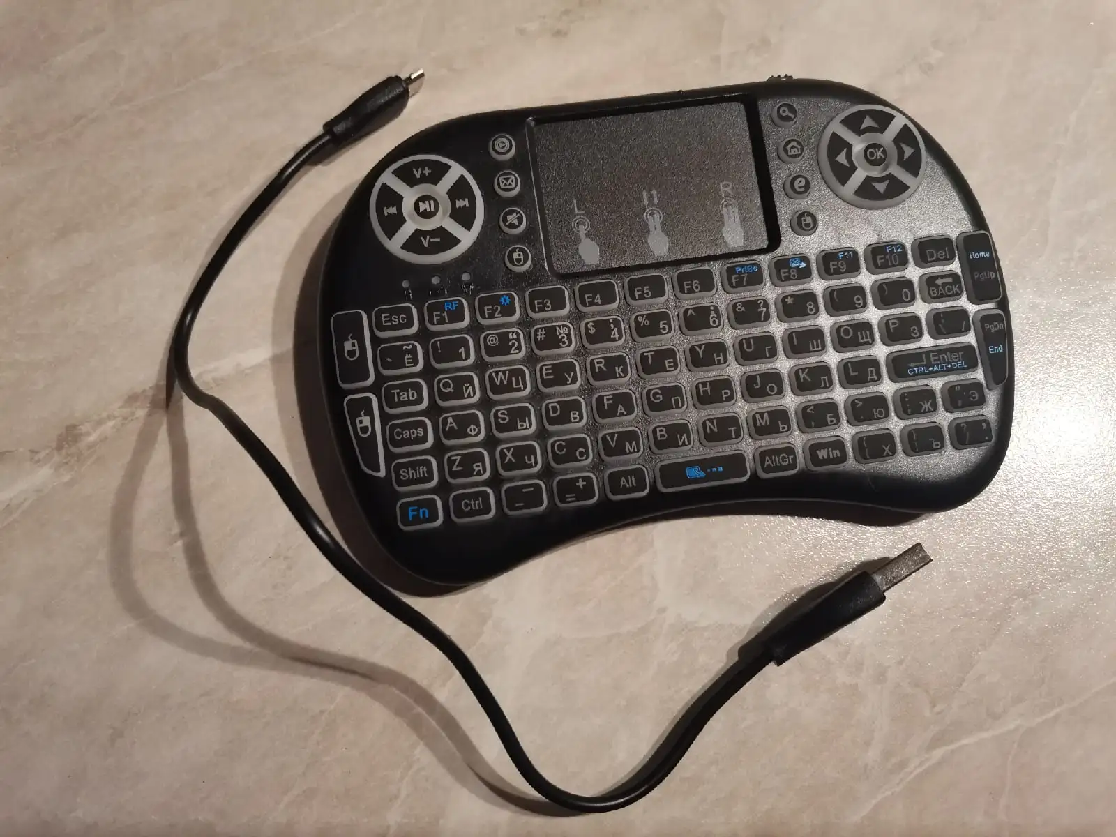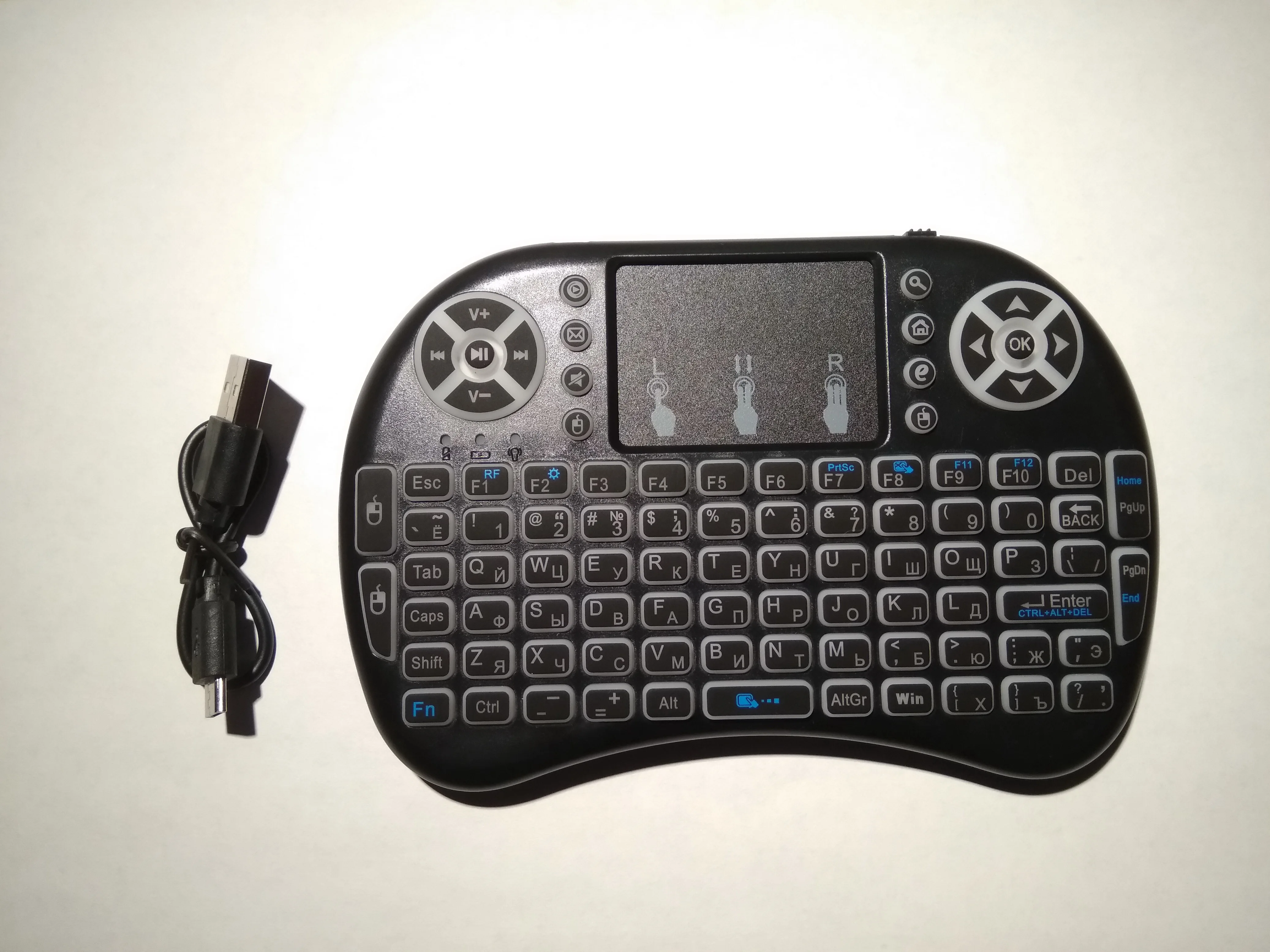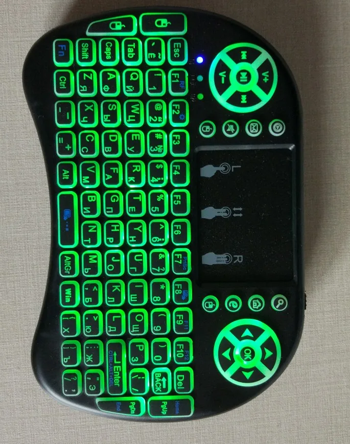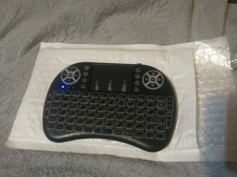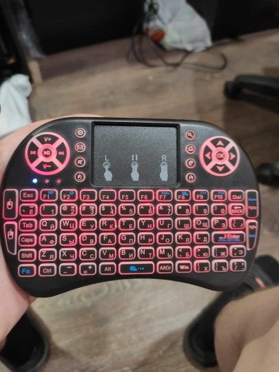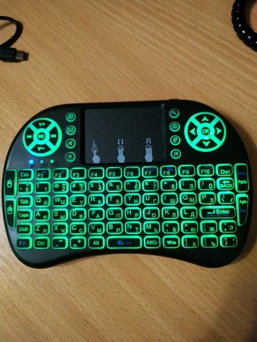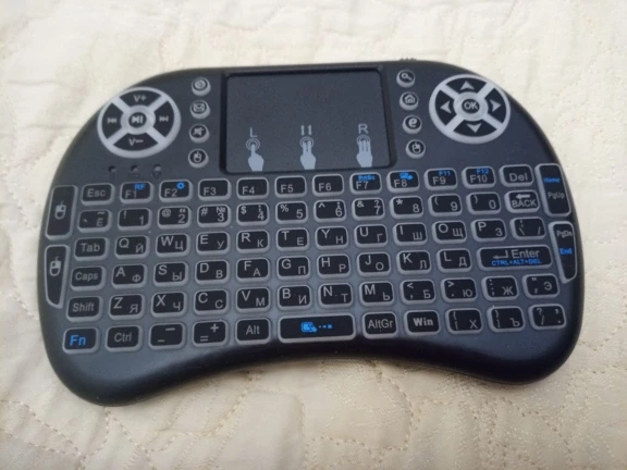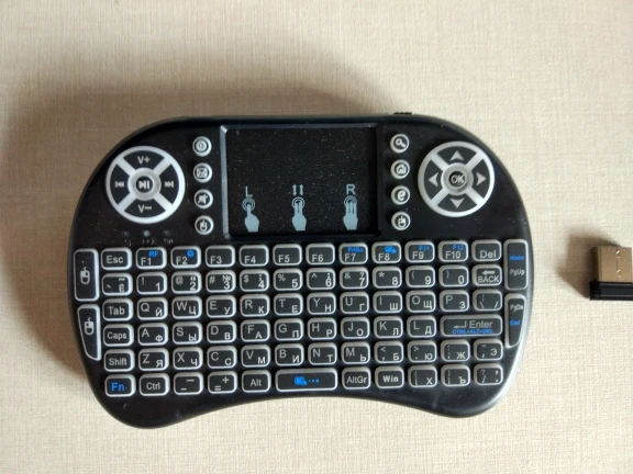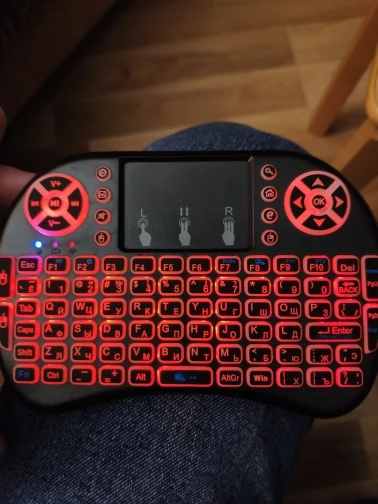 Хорошая маленькая клавиатуры. Взял для телика на Андроид ТВ. На компьютере тоже прекрасно работает. Все команды нормально исполняются. Клавиши мультимедиа прекрасно работают. Тач довольно чувствительный и эту чувствительность можно менять. Когда горит белая или красная подсветка, клавиатура издает какой-то писк. Подсветка быстро гаснет, если ничего не наживать. Русские буквы выглядят отлично. Доставили быстро, в комплекте шла инструкция на английском.