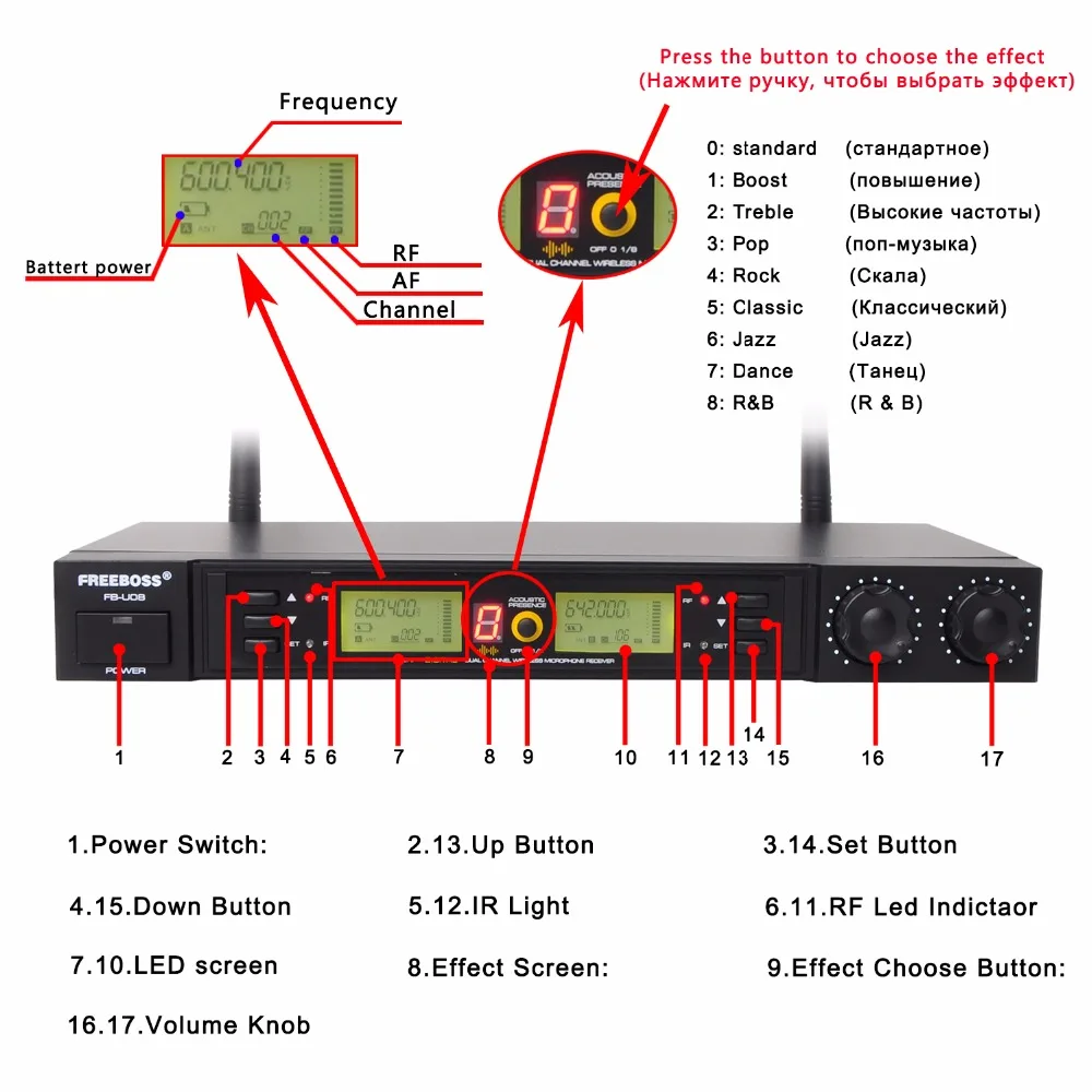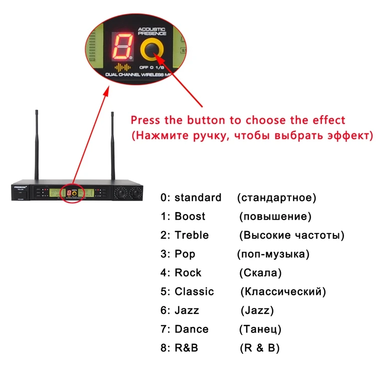 9) Кнопка выбора эффекта: Нажмите, чтобы выбрать звуковой эффект