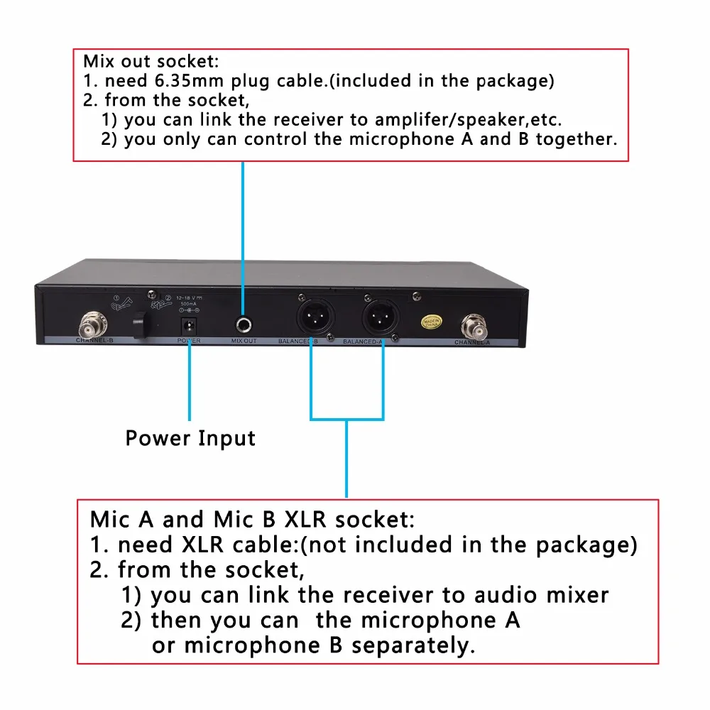 Приемник: металлическая коробка с пластиковой передней панелью, выключатель питания, индивидуальная Ручка громкости, индикатор AF/RF. Два отдельных выхода XLR и один смешанный выход 1/4 ".