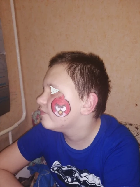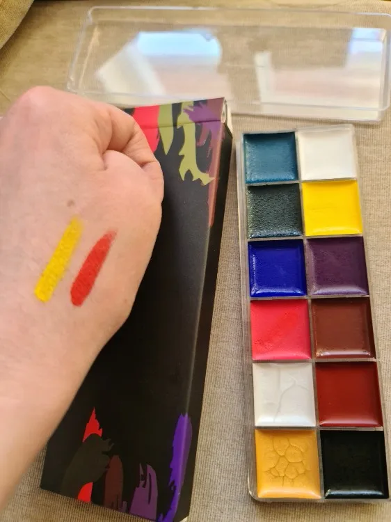 Доставлено в заявленые сроки. Наносится хорошо. Красный и розовый сложнее отмывается, чем другие цвета. В целом покупкой довольна. Побаловаться с детьми - норм. Цена/качество соответствует. На фото немного стерлась картинка - маску одевал.