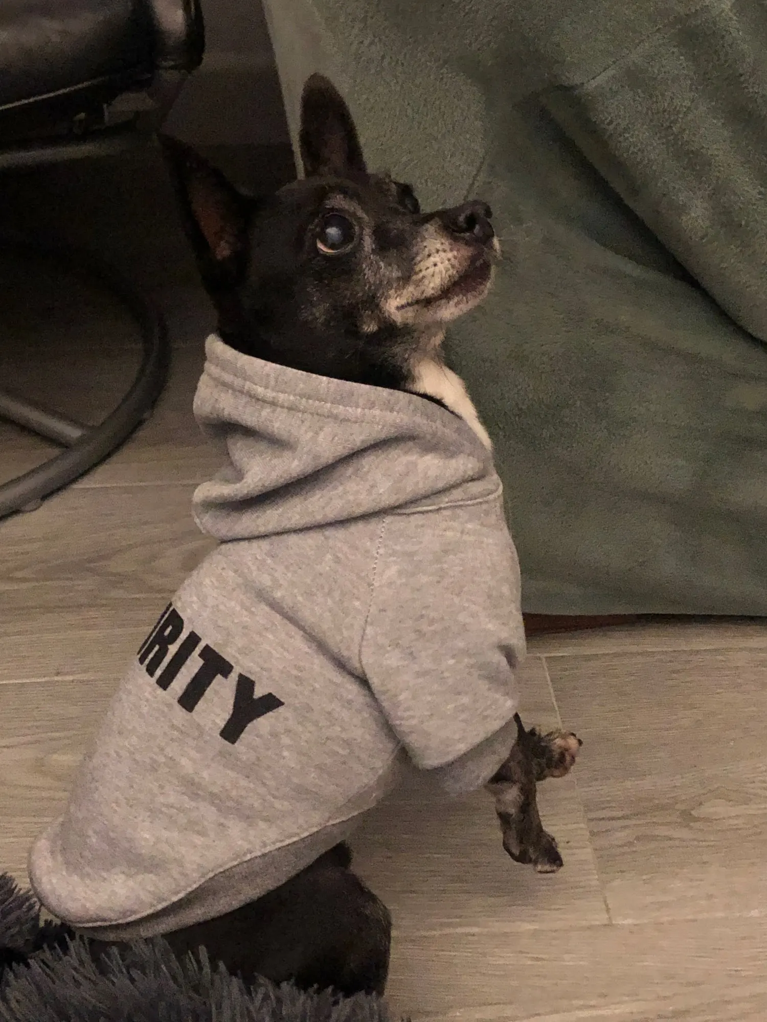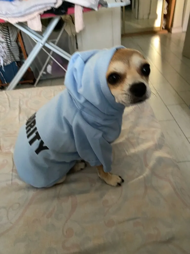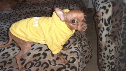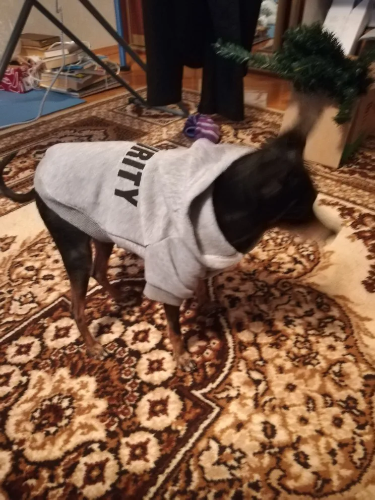 Думала кофта будет совсем тоненькая, а она с утеплением, с начёсиком, так даже лучше. Подошла на чихуахуа 1 кг. Без запаха и лишних ниток