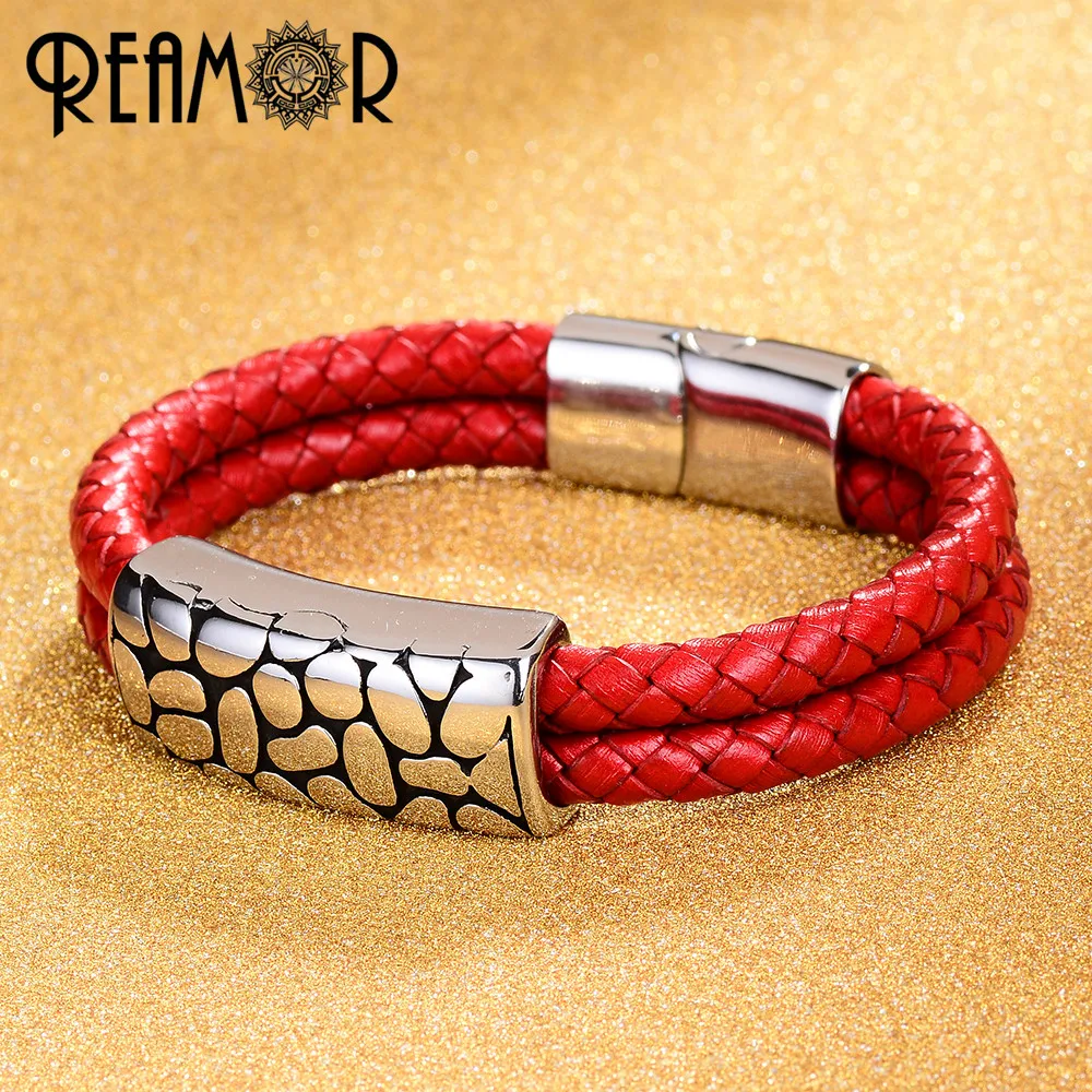 Мужской браслет с бусинами REAMOR из нержавеющей стали 316L, красный двойной плетеный кожаный браслет с подвесками, модные мужские и женские ювелирные изделия
