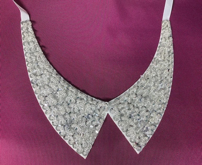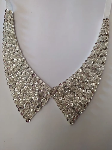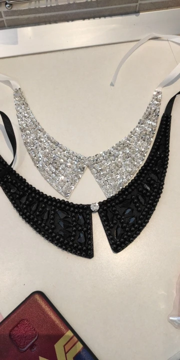 Очень красивый воротник. Можно успешно носить на женщин, которые подходят к женской моде. Кроме того, шикарная приталенная черная одежда высокого качества и балетки на плоской подошве. Просто Носите простые серьги-гвоздики и часы .... другие ювелирные изделия не требуются! Блестки, отделка бисером и лента идеальны. Комплименты при первом ношении. Спасибо!♀②❤
