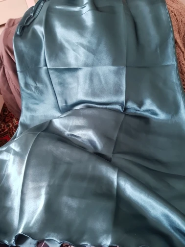 Ткань превосходная. Не тянется, плотная, не прозрачная, блестящая, гладкая, божественно приятная на ощупь. Все швы аккуратные ровные, нижний край обработан хорошо - смотрится стильно и элегантно. Фурнитура прекрасно дополняет образ. Длина лямок легко регулируется. На 44 размер длина сорочки на средний рост - по колено. Такую сорочку хочется надевать снова и снова - радостно! Ласковая и невероятно приятная во всех отношениях. Спасибо большое!!!