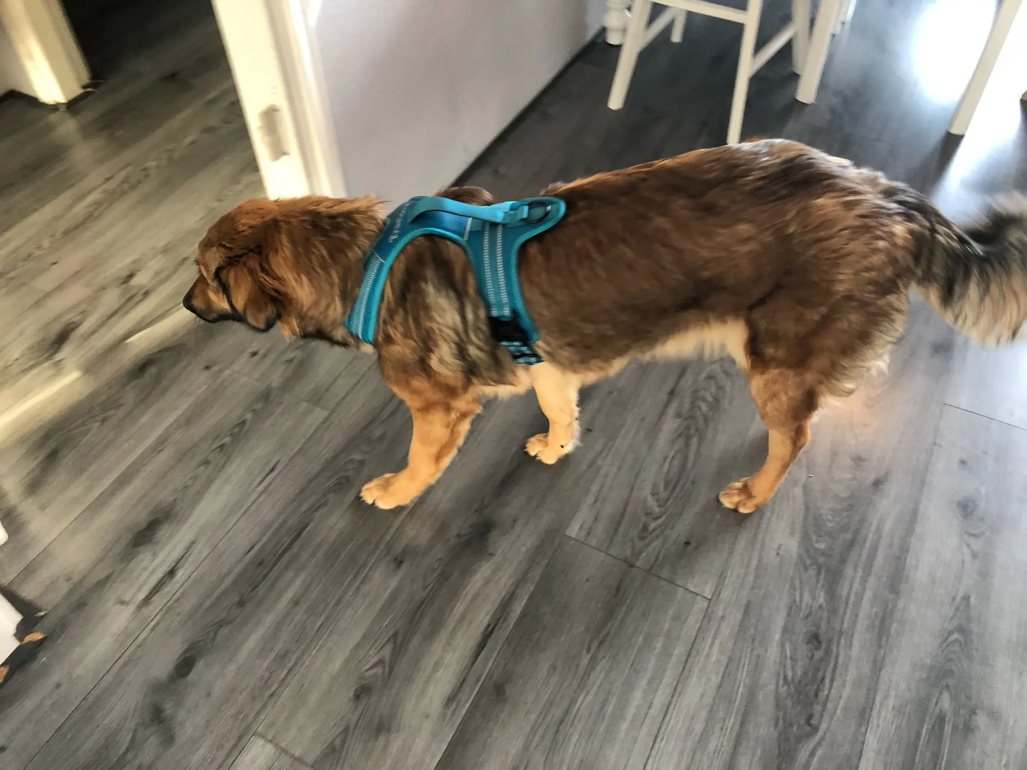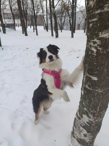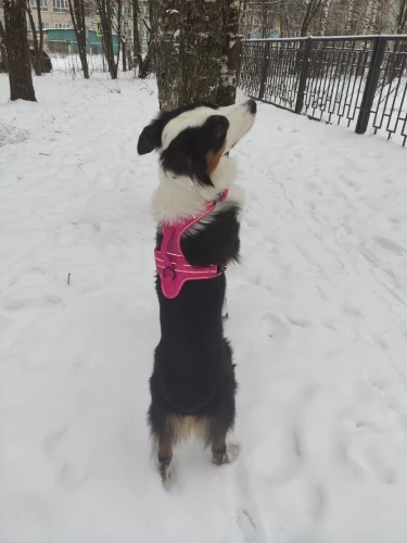 Шлейка немного другого цвета (более голубая), чем на фото. Материал довольно жесткий, особенно искусственная кожа на спине. И шлейка не садится по собаке, а топорщится на спине дугой. При этом ручка (из-за этого изгиба) плотно прилегает к шлейке, так что за нее сразу и не возьмешься. Собаке неудобно, подмышки натирает, в шею упирается. Я недовольна: дорого и неудобно.