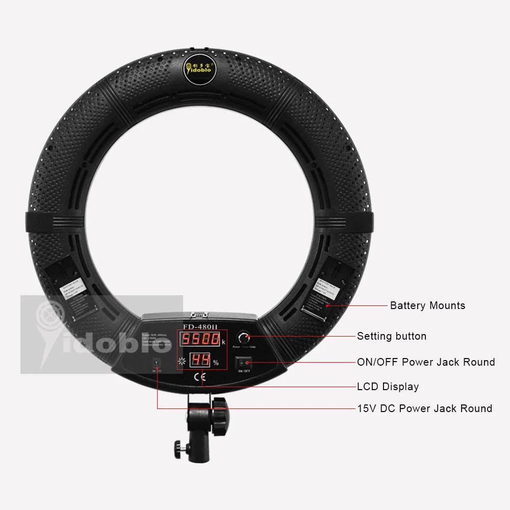 Серия FD состоит из высокоярсветодиодный ных чипов SMD, срок службы до 50000 часов. Эта серия более эффективна и энергосберегает, даже может достичь наименьшего уровня потерь светильник. Работает с двумя аккумуляторами Sony F750/970 (14,5 в) или адаптером переменного тока (110-220 В). Регулируемый диапазон цветовой температуры от 3200 до 5500K. Серия FD подходит для съемки на открытом воздухе. Персонажи и свадебная фотография, освещение макияжа и студия.Особенности:1) светодиодный кольцевой светильник, более высокий CRI: более 95RA, Диммируемый 10%-100%, без мерцания2) умный и компактный дизайн, удобство переноски.3) цифровой экран для отображения выходной мощности, цветовой температуры, канала4) используется высокотехнологичная импортная Светодиодная трубка с более чем 50000 часов работы.5) подходит для внутренней и наружной съемки и видеосъемки, портретной и свадебной съемки, интервью и т. Д. Особенно подходит для детской фотосъемки.Характеристики:Модель: FD-480Цветовая температура: 3200K-5500K ± 200K (двухцветная плавная регулировка)Новый дизайн: DigtalМощность: 96 Вт (480 светодиодов)Напряжение: 110-220 В переменного тока/15 В постоянного тока/две батареи SONY 750/970Люмен: 3300 Люкс/0,5 м, 1000 Люкс/1 мИндекс цветопередачи: 95RAУгол освещения: 60 градусовЭффективное расстояние: 30 метровРазмер: внешний диаметр: 18 дюймов/45 смПосылка входит: