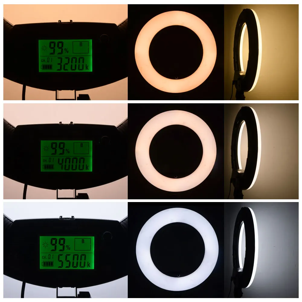 FE серия состоит из высоко яркая SMD светодиодный Чипсы, срок службы до 50000 часов. Эта серия является более эффективной и энергосберегающей, даже может достичь наименьшего уровня потери светильник. Работает с двумя Sony F750/970 батареи (14,5 V) или адаптер переменного тока (110V-220V). Регулируемая Цветовая температура от 3200-5500K. Серия FE подходит для наружной съемки. Персонажи и свадебные фотографии, освещение для макияжа и студии.Особенности:1) светодиодный кольцевой светильник, более высокий CRI: более 95RA, затемнения 10%-100%, без мерцания2) умный и компактный дизайн, легко носить с собой.3) супер ЖК-экран, чтобы показать выходную мощность, цветовую температуру, канал, пульт дистанционного управления опционально для легкой работы.4) используется высокотехнологичный импортный светодиодный светильник с более чем 50000 часов работы.5) подходит для внутренней и наружной фотографии и видеосъемки, портретной и свадебной фотографии, интервью и т. Д. Особенно удобно для детской фотосъемки.Характеристики:Модель: FE-480Цветовая температура: 3200K-5500K ± 200K (двухцветная плавная регулировка)Новый дизайн: ЖК-экран, пульт дистанционного управления, Встроенный приемникМощность: 96 Вт (480 светодиодов)Напряжение: 110-220 В переменного тока/15 В постоянного тока/два аккумулятора SONY 750/970Световой поток: 3300 Lux/0,5 m, 1000 Lux/1 мИндекс цветопередачи: 95RAСветильник угол: 60 градусовЭффективное расстояние: 30 метровРасстояние управления: 50-80 метровРазмер: внешний диаметр: 18 дюймов/45 смПосылка включает в себя: