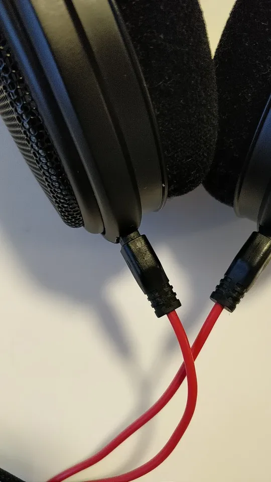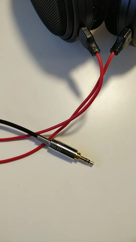 Действительно хороший кабель. Красная часть кабеля приятный и мягкий силикон, как материал. Не слишком тонкий, не слишком толстый. Основная часть od кабель покрыт нейлоном или любым другим. Это не текстиль, поэтому он не мягкий на ощупь, но и не жесткий. Разъемы идеально подходят для банок. В целом я очень доволен. Он кажется кабелем, который вы хотите использовать на ваших наушниках 300 + usd. Протестировано HD660s.