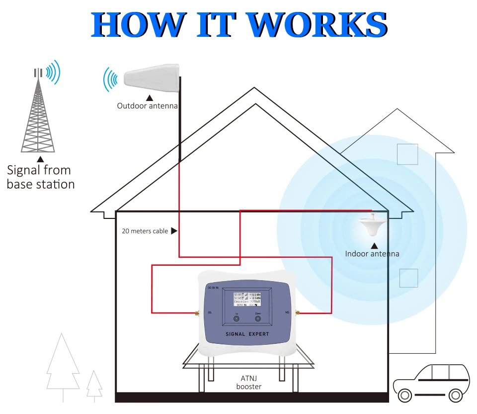 1. Получает сигналМощная антенна достигает доступа к хорошему сигналу и доставляет его к бустеру.2. Повышает сигналУсилитель получает сигнал, усиливает его и служит в качестве реле между вашим телефоном и ближайшей башней сотовой связи.3. Сигнал передачиВаши устройства получают увеличенный прием ячеек, а звонки и данные подаются через усилитель обратно в сеть.Примечание: пожалуйста, убедитесь, что место, где вы собираетесь установить GSM 900 МГц и WCDMA 2100 МГц, и убедитесь, что вы можете получить по крайней мере 2 бар 2G и 3G сигнал на открытом воздухе перед покупкой, В противном случае этот продукт не может вам помочь. Для улучшения сигнала в помещении необходим хороший внешний сигнал.