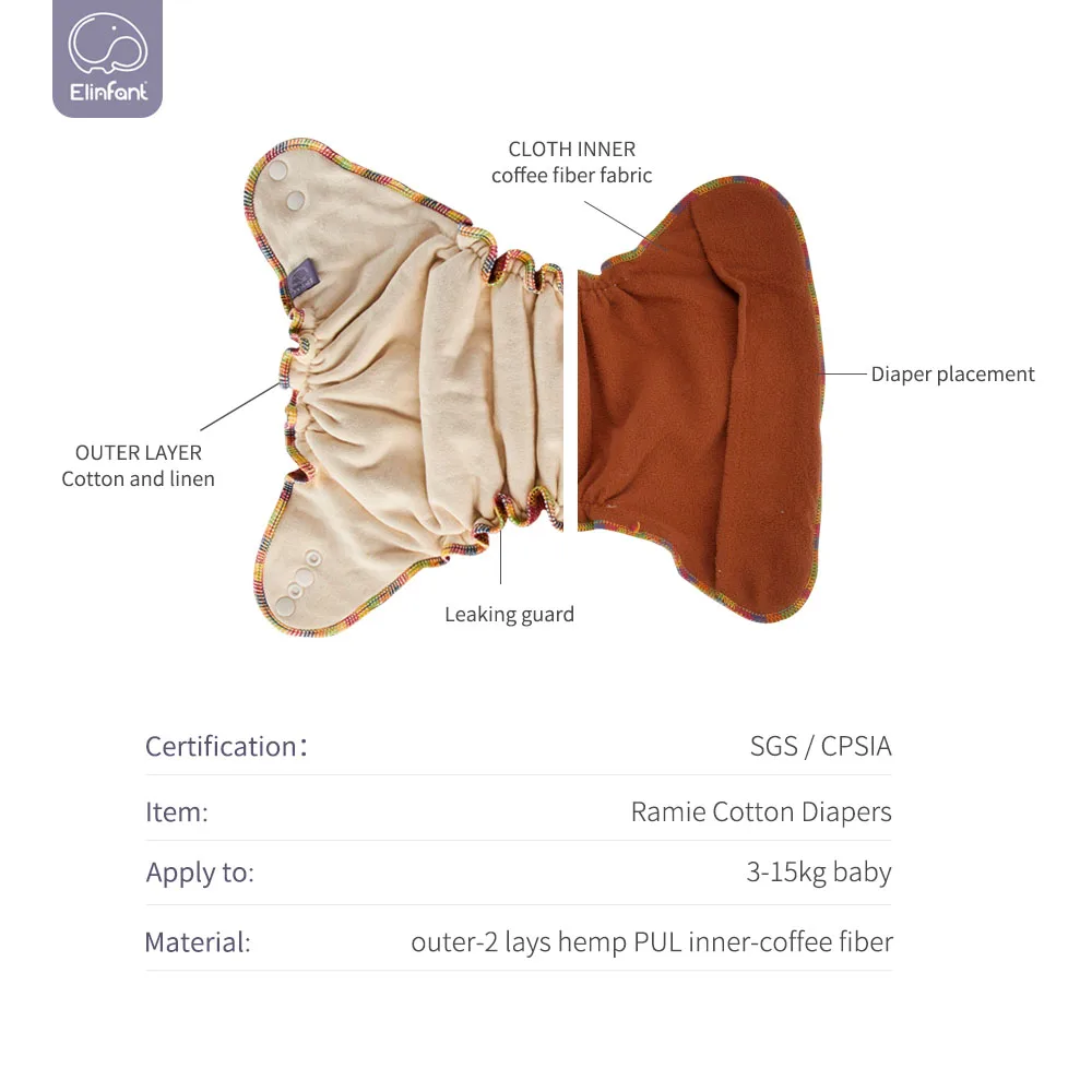 Elinfant кофейные флисовые многоразовые подходящие подгузники одного размера, ночные подгузники AIO AI2, моющиеся подгузники из конопляной ткани, 1 шт. в упаковке