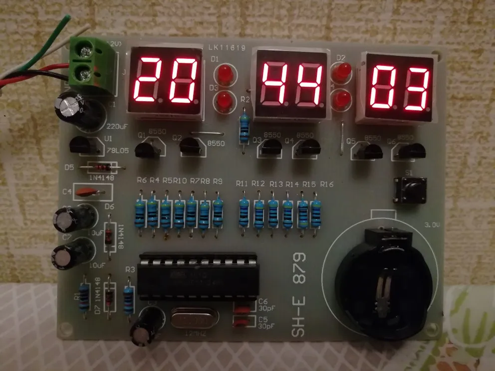 часы сразу не заработали, начал проверять без стабилизатора на 5В. посмотрел по даташиту распиновку ног стабилизатора и поменял наоборот на фотографии видно что стабилизатор запаян наоборот вот так. часы работают. спасибо продавцу.цена соответствует качеству.
