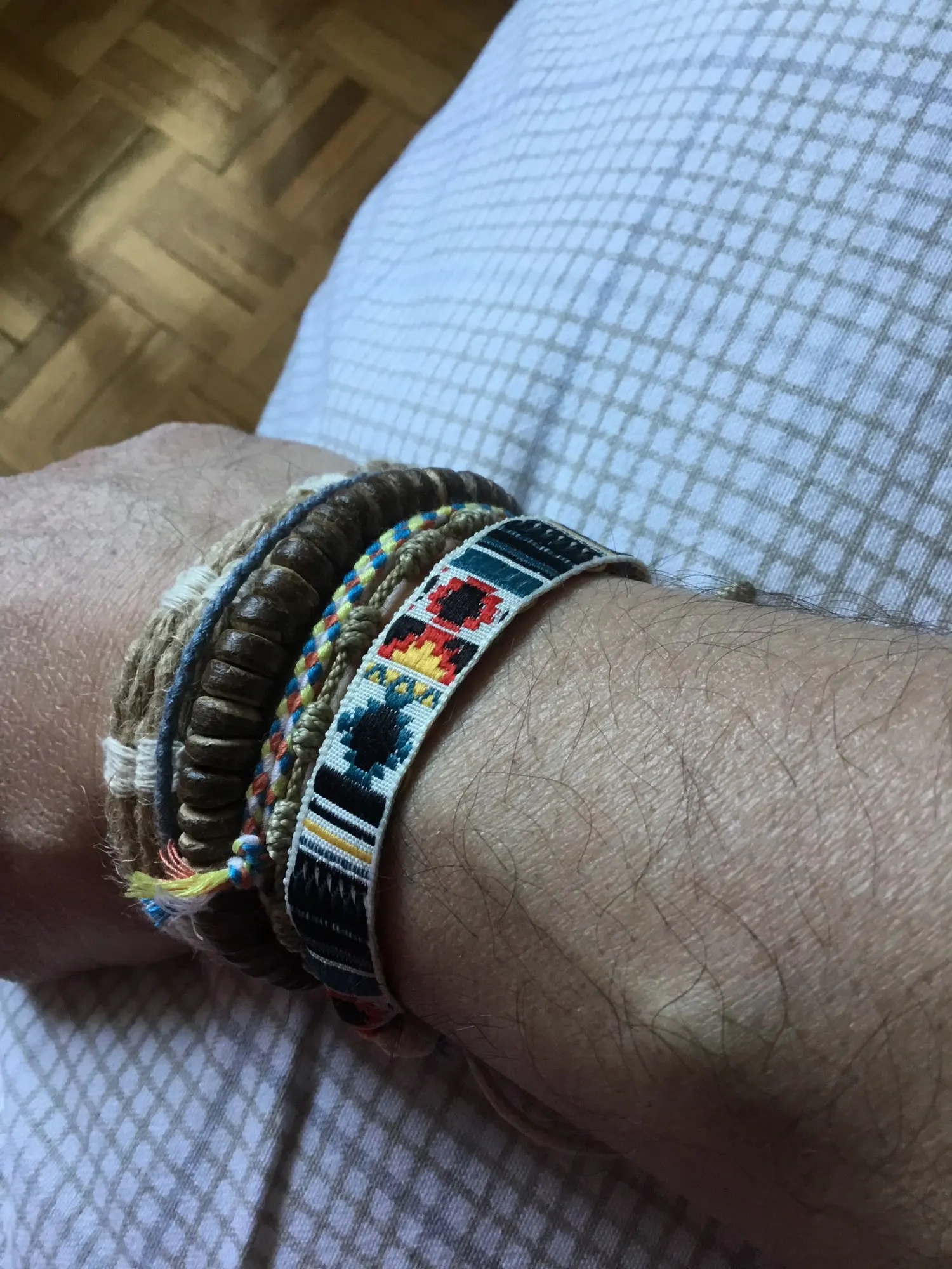 Очень хорошие, но деревянные браслеты из бисера, эластичные, маленькие, не стоят мужчин.