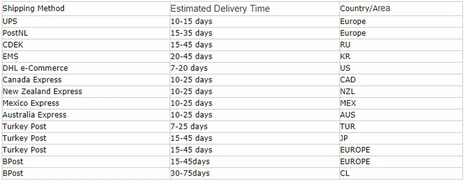 1. Пожалуйста, внимательно проверьте свой адрес после оформления заказа. Мы отправим вам товары сразу после получения оплаты. (Мы отправим товары в течение 2-5 дней (рабочих дней, не праздничных сезонов) после подтверждения оплаты) 2. При подтверждении заказа будет выбран способ доставки по умолчанию. Товары будут отправлены через Bpost ,Turkey Post ,PostNL,CDEK , DHL или другие. 3. Выбор способа доставки зависит от количества заказа и адреса. Подробности можно сообщить нам.