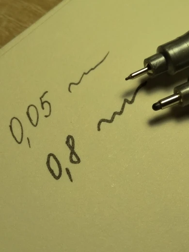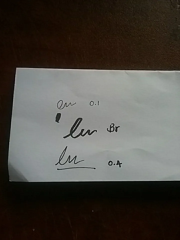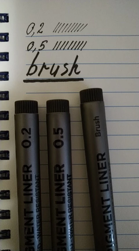 Посылка пришла почти на месяц позже обещанного срока. 0.2 начал высыхать уже, поэтому пишет тонко. 0.05 и brush вроде нормальные