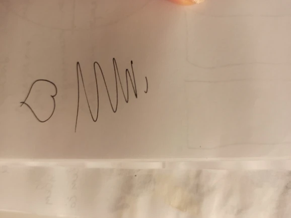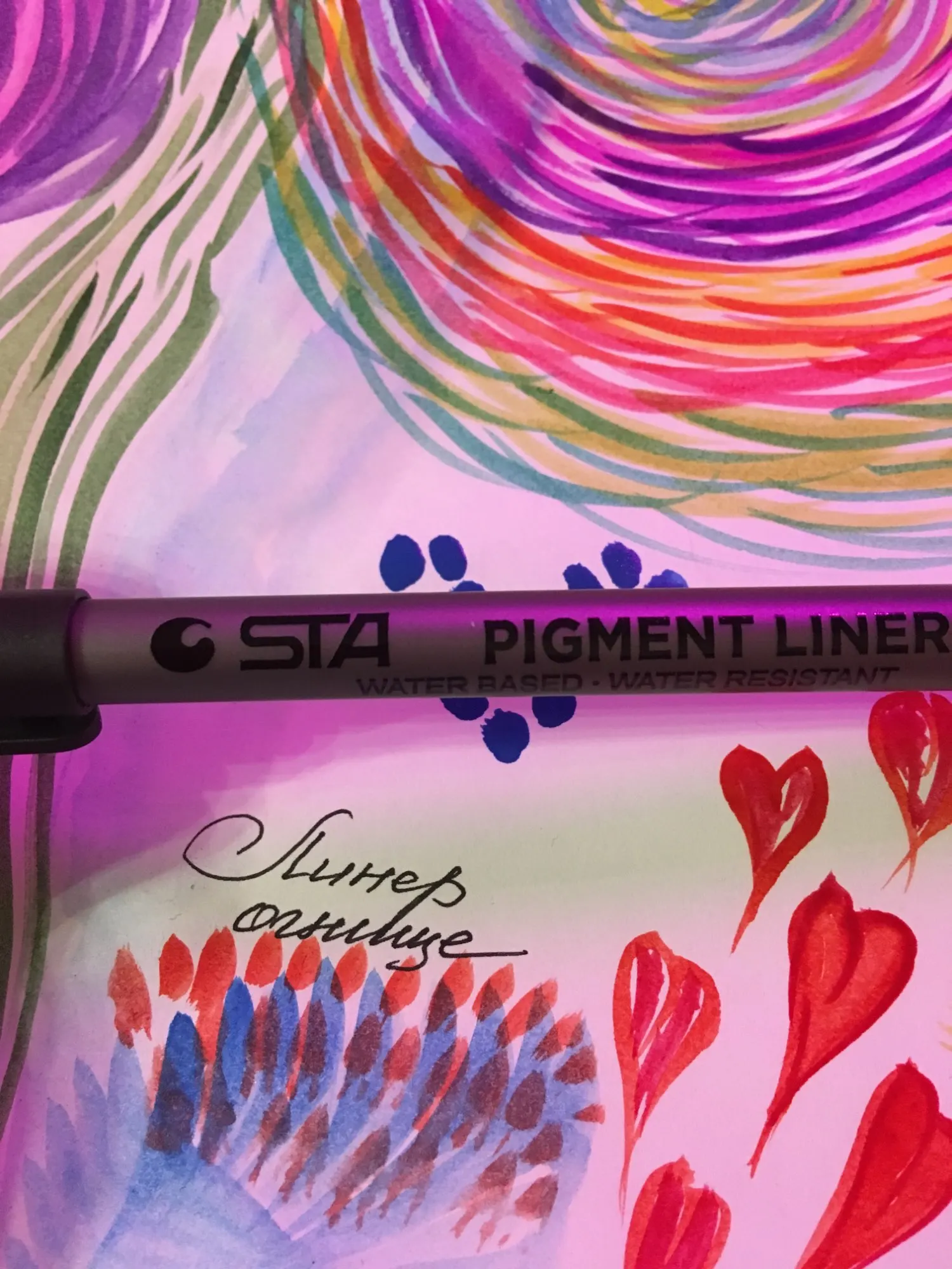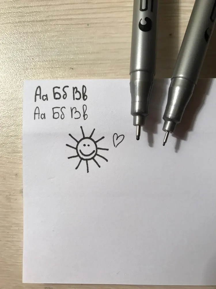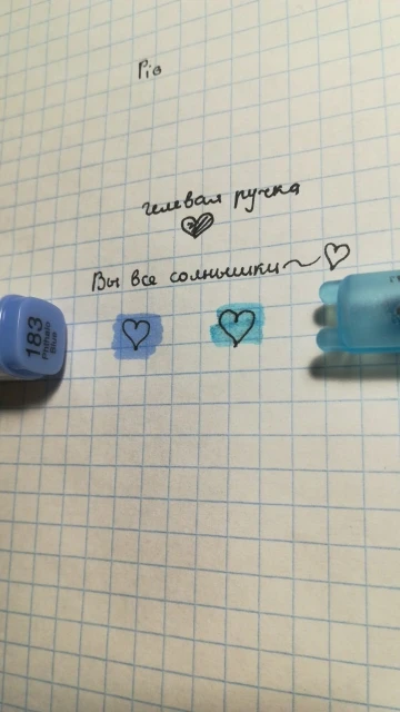Ручки хорошо пишут (все три, которые я заказала), толщина вроде нормальная (0,2), чуть чуть размылись спиртовым выделителем (сердешко справа), и вообще не размывается маркерами для рисования (сердешко слева) (с продавцом не общалась)