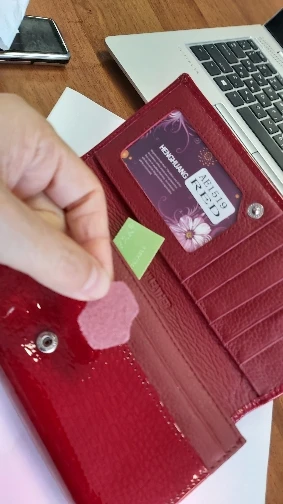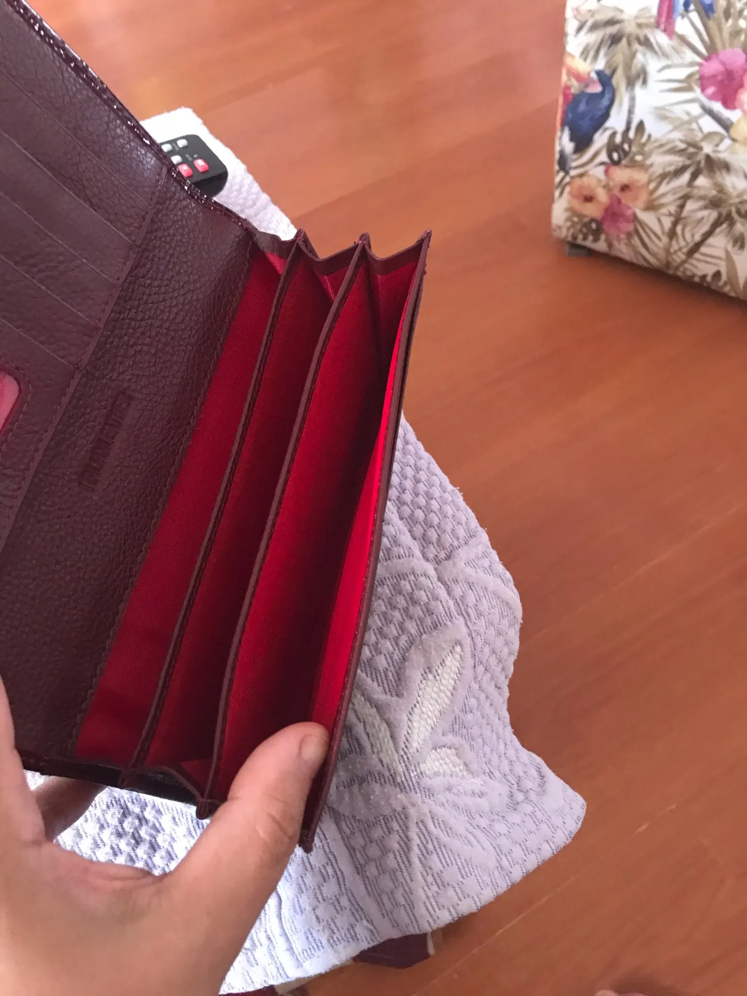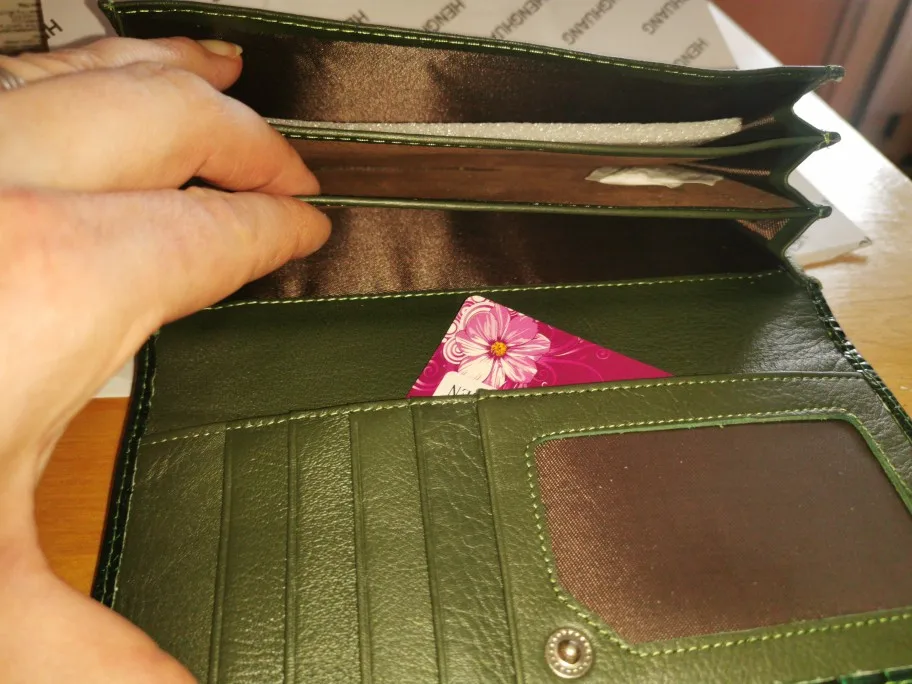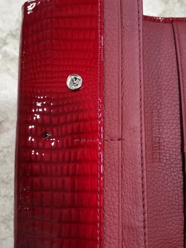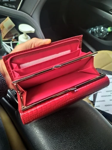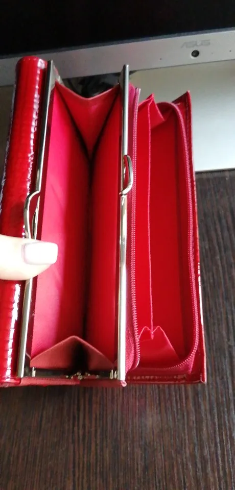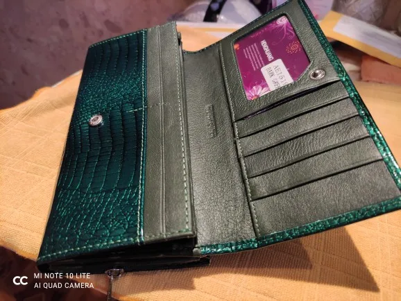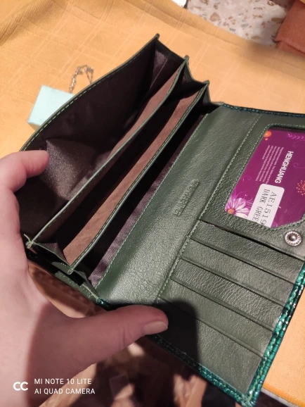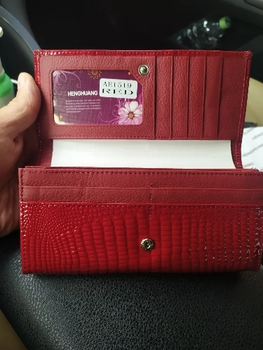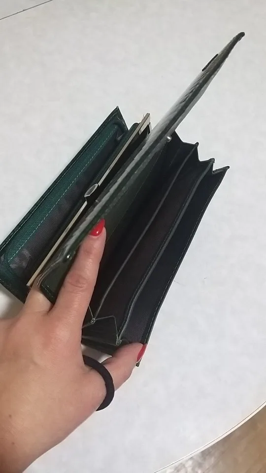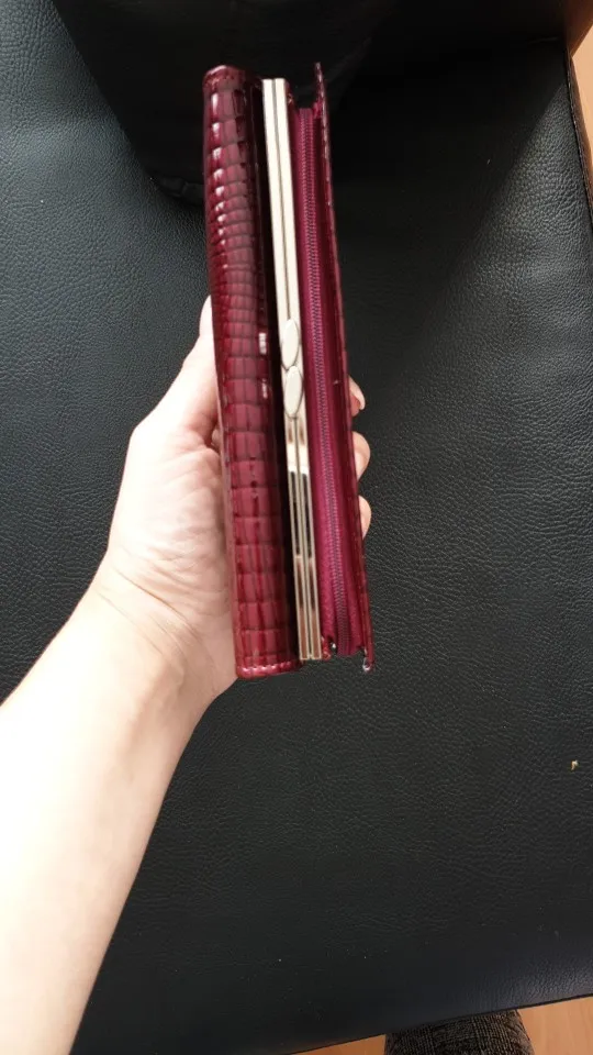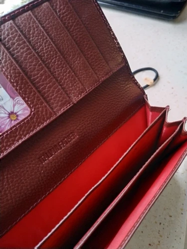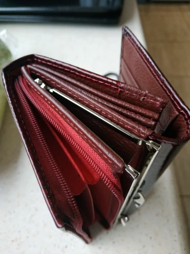 Very nice wallet. But the slots for plastic cards are small. Fast delivery. Очень красивый кошелек (брали темно-бордовый). Быстрая доставка. Единственный минус - отделения для карточек малы, надо растягивать.