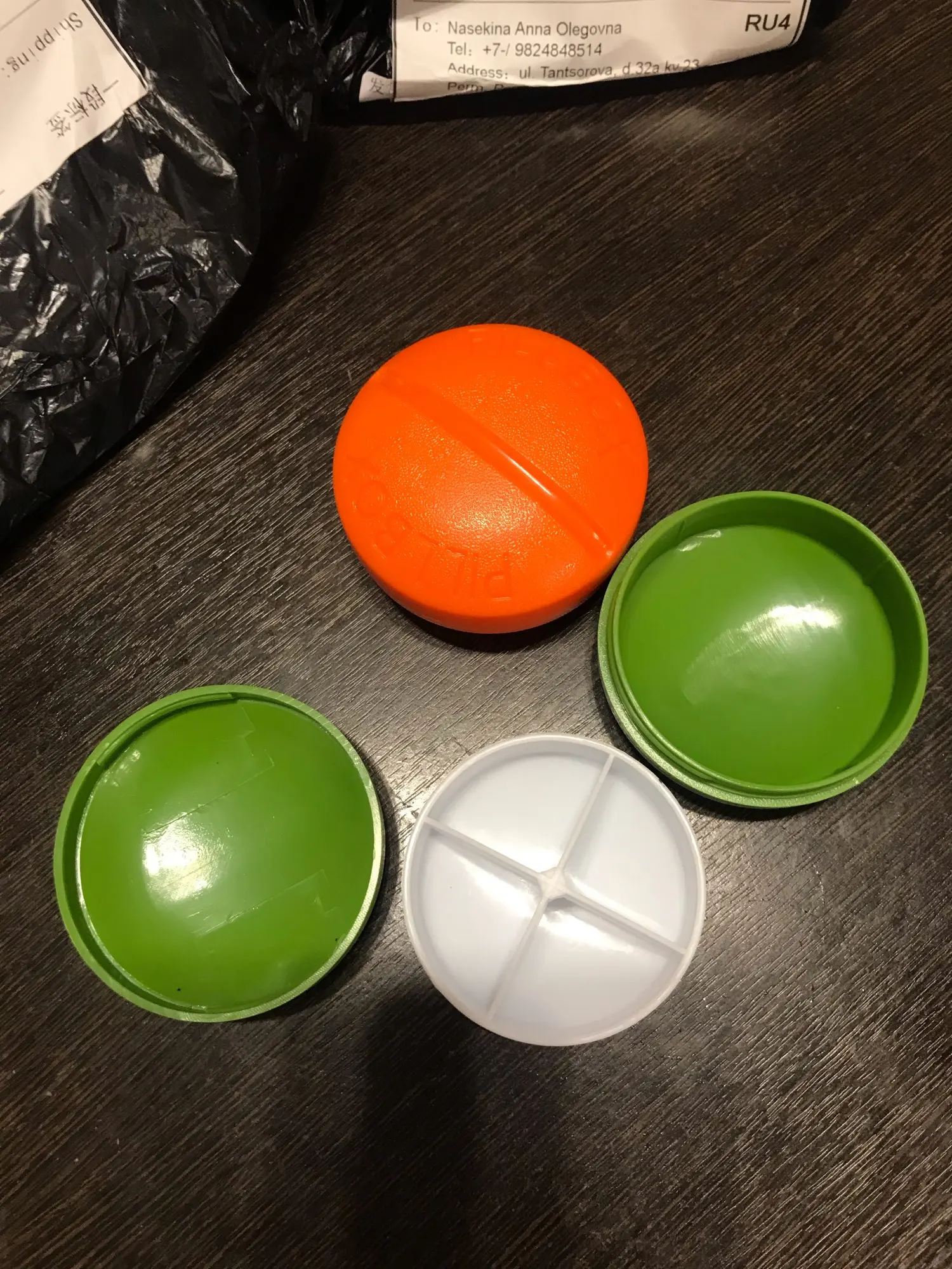 Таблетница в индивидуальной упаковке- коробке. Пришли вместе, упакованные в черный пакет. При транспортировке не сломались и не пошарпались. Цвета пришли нужные. Быстрая отправка и доставка, которая заняла 2 недели до СПб.