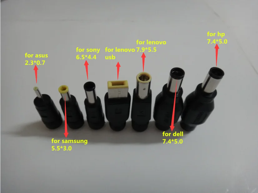 7 Спецификация: для hp 7,4*5,0/2: Для dell 7,4*5,0/3: Для lenovo 7,9*5,5/4: для usb-порта lenovo/5: Для sony 5:6.5*4,4/6: для samsun 5,5*3,0/7: для asus 2,3*0,7