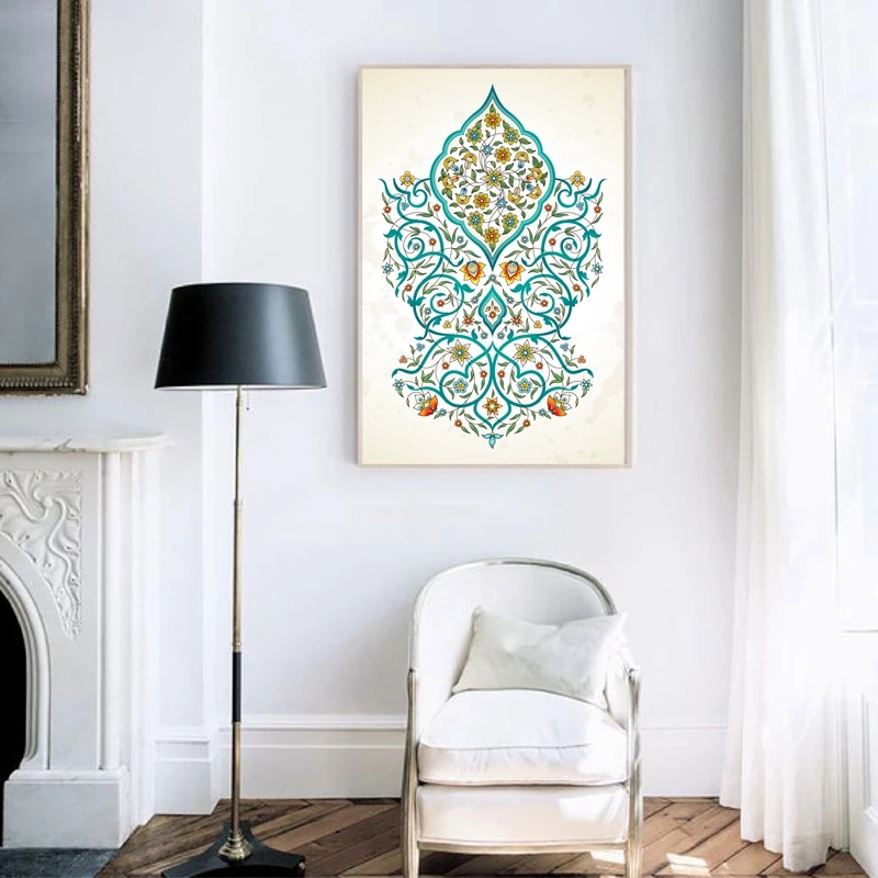 Арабская искусственная мусульманская Картина на холсте с изображением всевластной мечети Аллах, бирюзовый цветочный принт, мусульманское украшение