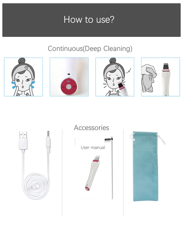1. Глубокая чистка черных точек-через 25000/с высокочастотная вибрация, загрязнения в порах разбиваются и разряжаются, а с помощью средств по уходу за кожей можно быстро удалить черные точки, омертвевшую кожу, грязь и масло в ваших порах. Он чище, быстрее и глубже, чем вакуумное средство для удаления черных точек, и поры больше не будут открываться.2. Функция EMS-EMS может транспортировать питательные вещества в слой кожи через электричество. Ускоряет обмен веществ, обновляет клетки кожи, смягчает старый кератин, снимает меланин и твердые морщины. Помогает вернуть эластичность и сделать вашу кожу упругой, гладкой и нежной.3. 4 функциональных режима-Очистка: сильные вибрации могут проникать в вашу кожу на глубину около 3-5 мм и эффективно очищать поры кожи; Глубокое очищение (экспорт ионов) может эффективно удалять черные точки, акне, белки; Увлажнение (ионный импорт): Ведущая в питании и подушечки; Лифтинг: Улучшает способность кожи поглощать мелкие линии и морщинки для уменьшения.4. Простота в использовании-нажмите и удерживайте кнопку питания в течение 2 секунд, чтобы включить устройство, затем нажмите кнопку, чтобы выбрать нужный режим, он эффективно удаляет черные точки и омертвевшую кожу. Внимание: при чистке важно всегда держать кожу влажной.