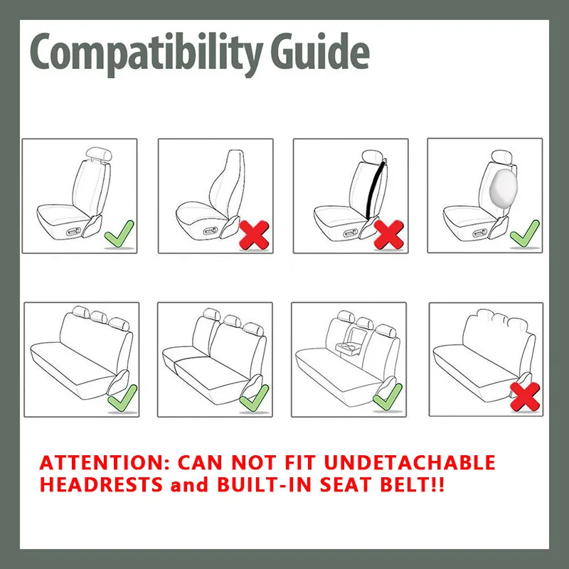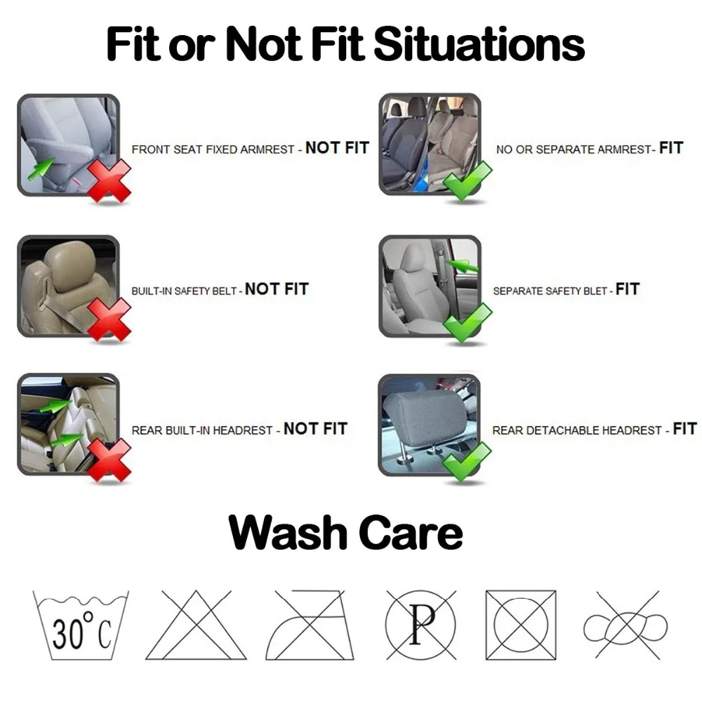 Эти универсальные чехлы на сиденья не подходят на 100%, пожалуйста, убедитесь, что подголовники как на переднее, так и на заднее сиденье должны быть сняты перед размещением заказа! Чехлы на сиденья не подходят на транспортные средства со спортивными сидениями Не подходит для транспортных средств со встроенными подголовниками Настройки монитора и экрана от фактических цветов от оригинального товара могут незначительно отличаться от фотографии!Упаковка включает: