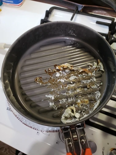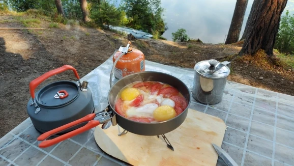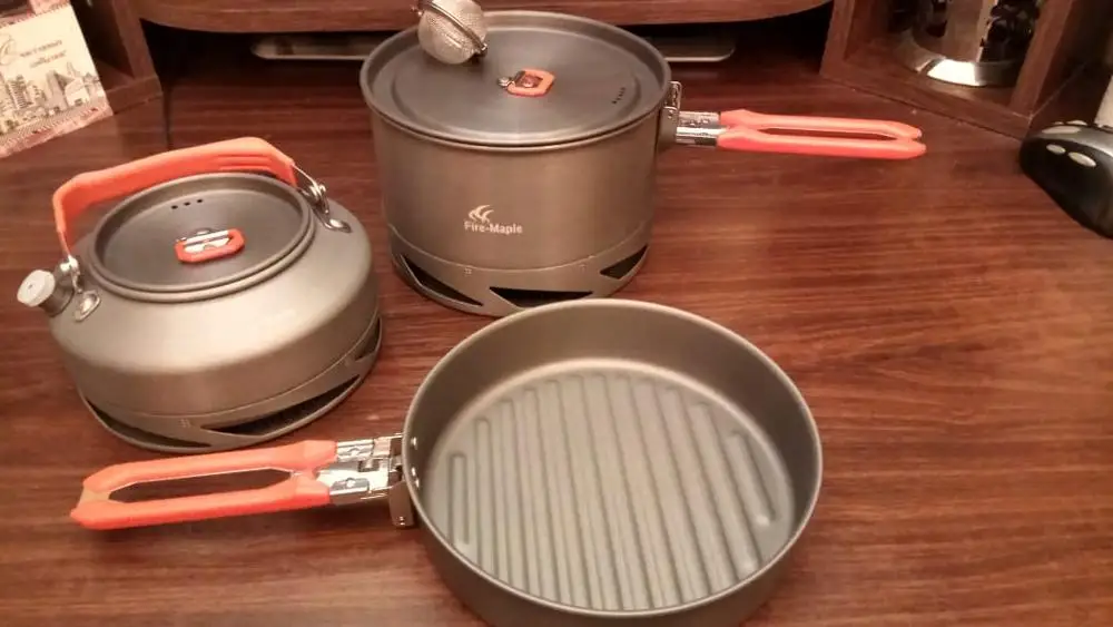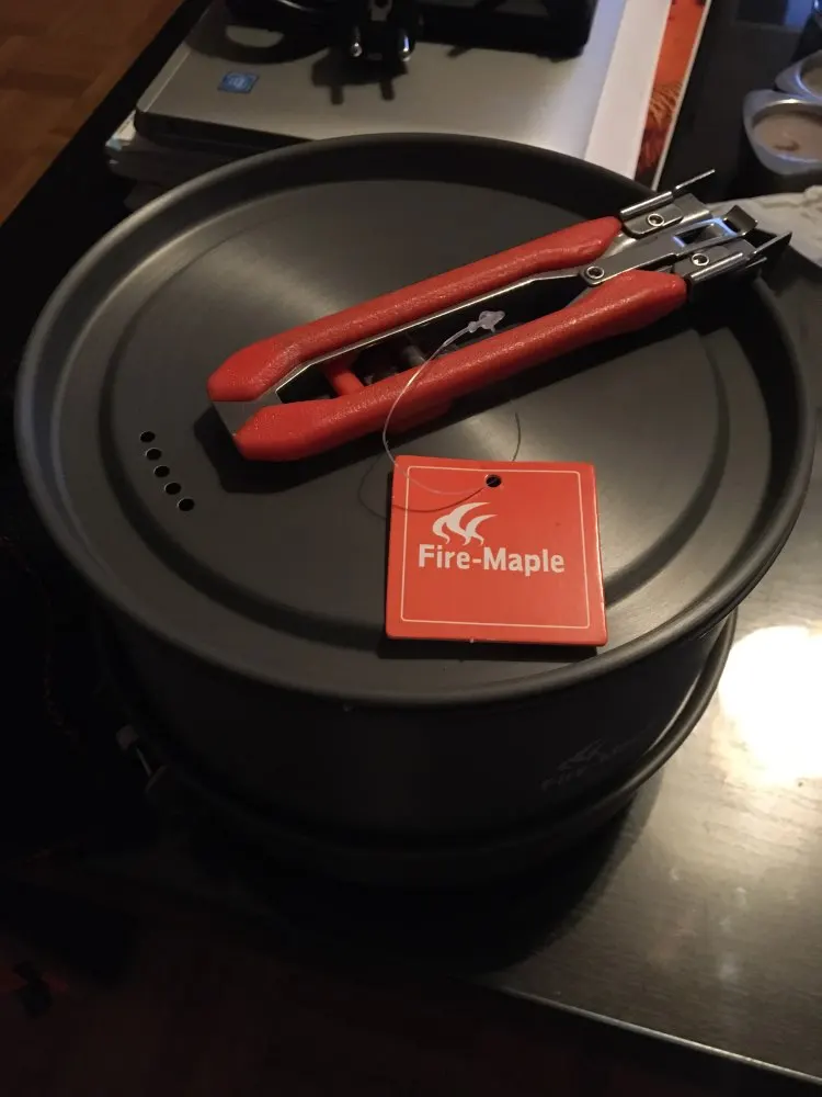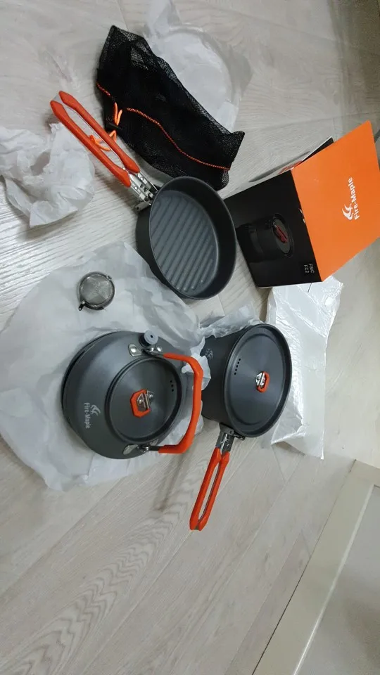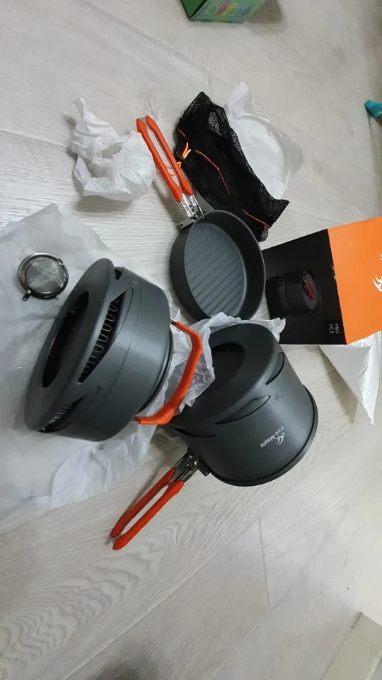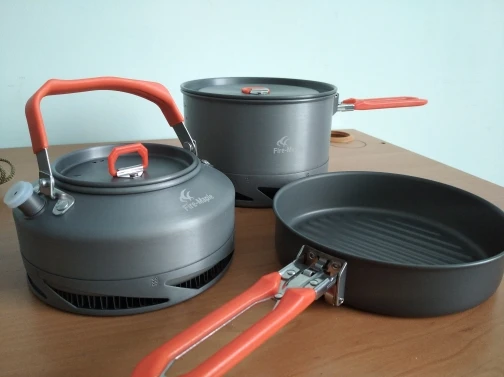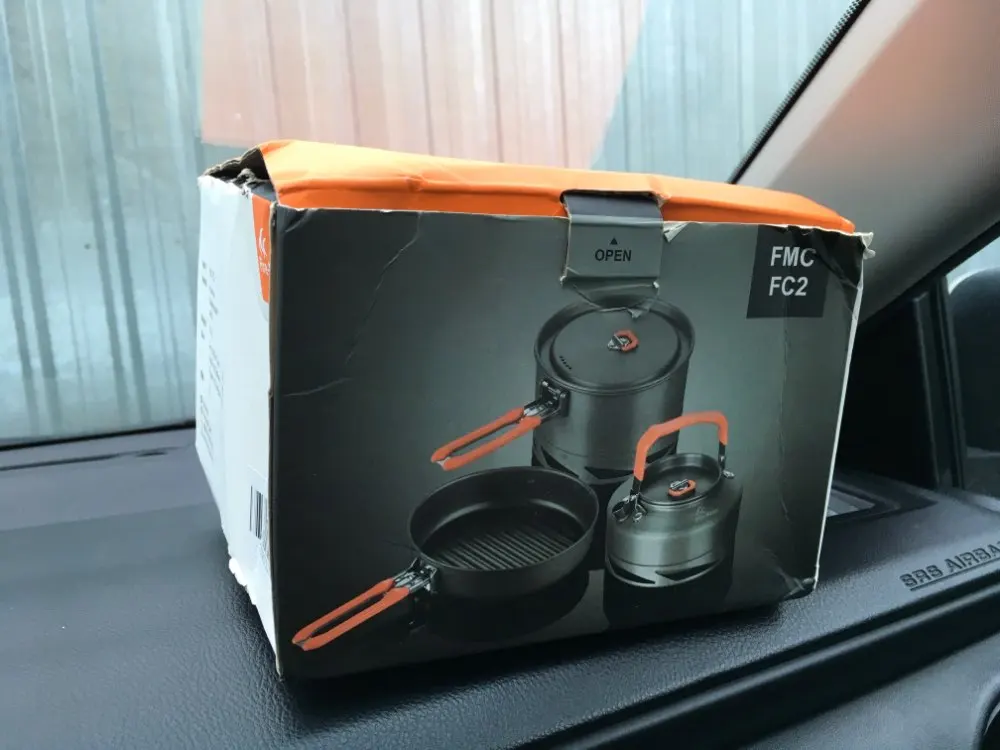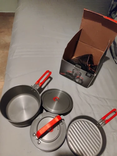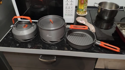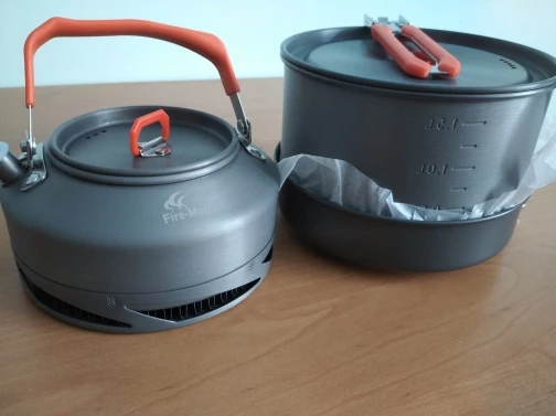 Набор пришёл с небольшими погнутостями и парой царапин, но ничего существенного. В целом доволен. Размеры конечно не большие, комфортное использование для 2х человек, не более. Очень порадовало, что моя горелка поместилась в чайнике.