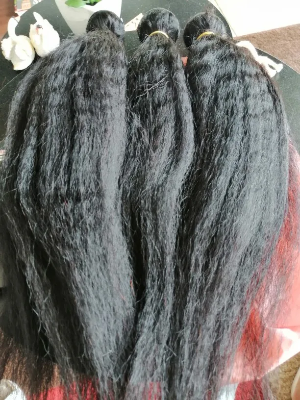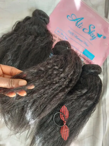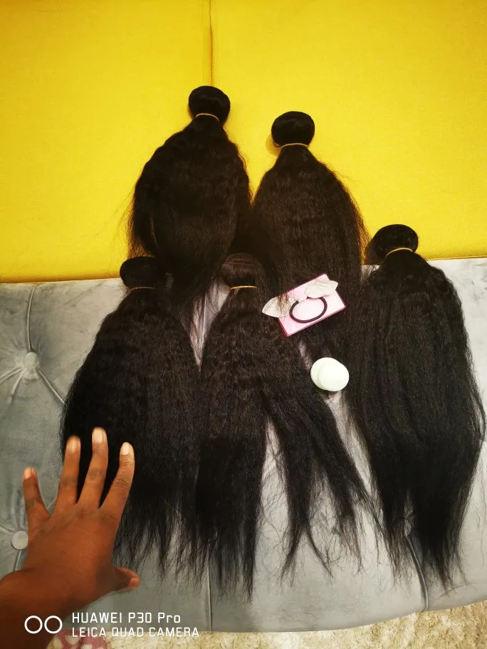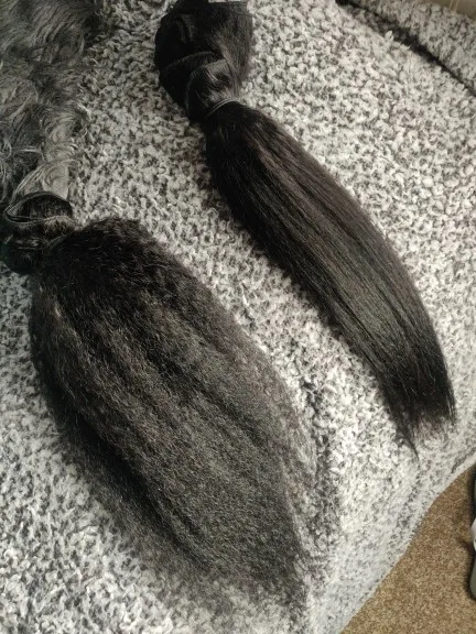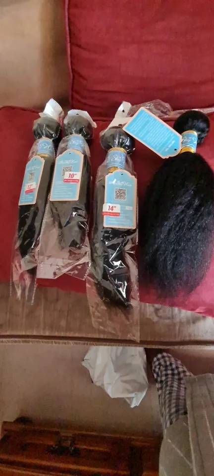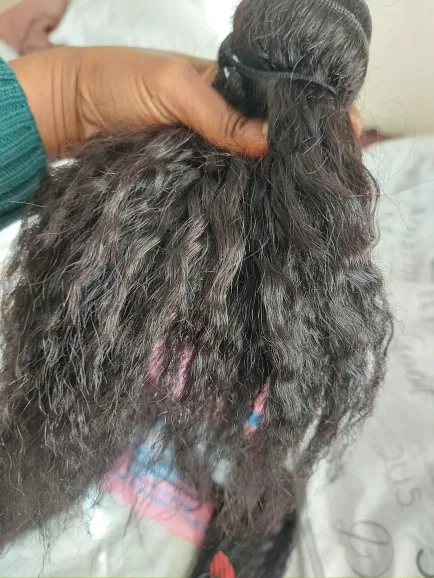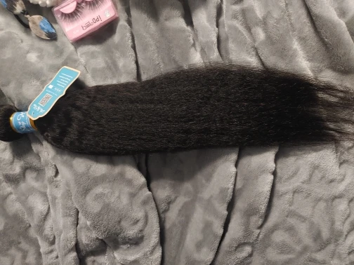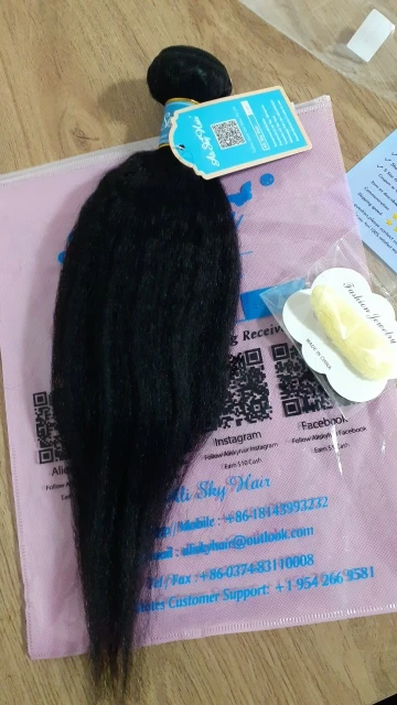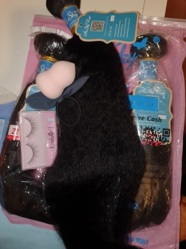 This hair is very good, ladies!! It's my first order from this shop so I didn't know what to expect and I was a bit afraid that the quality would not be good. Because I had a bad experience with with different shop. Nonetheless, when the bundles arrived, I was super delighted because now I can get my 1st weave install after having my natural grown over the past two years. This hair matches 4C hair when it's stretched/blow dried!! I washed it completely and when it's dried the kinky texture appears even better!!! Make sure to wash it with a moisturizing shampoo with argan oil, followed by a conditioner with argan oil. As for the delivery, it was quicker than expected and the communication with the seller is definitely 5 !! They kept updating me regarding my order and they even added a gift (false lashes and a hair band). I don't wear false eye lashes, and wanted the makeup sponge instead. They told me that next time I will order, I should tell them what gift I would like.