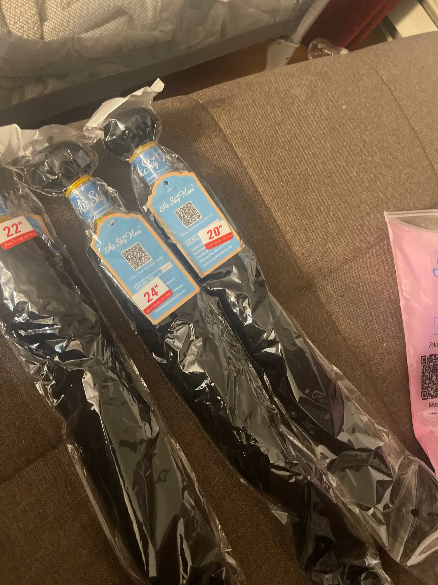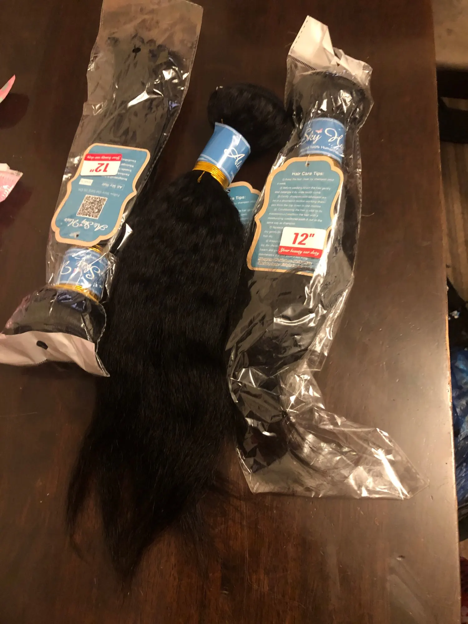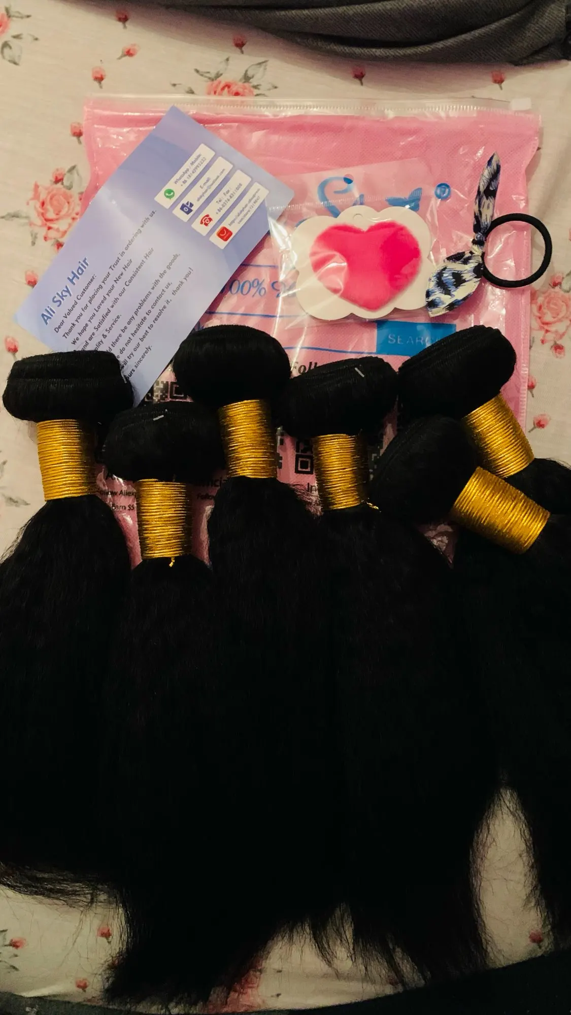 This hair is very good, ladies!! It's my first order from this shop so I didn't know what to expect and I was a bit afraid that the quality would not be good. Because I had a bad experience with with different shop. Nonetheless, when the bundles arrived, I was super delighted because now I can get my 1st weave install after having my natural grown over the past two years. This hair matches 4C hair when it's stretched/blow dried!! I washed it completely and when it's dried the kinky texture appears even better!!! Make sure to wash it with a moisturizing shampoo with argan oil, followed by a conditioner with argan oil. As for the delivery, it was quicker than expected and the communication with the seller is definitely 5 !! They kept updating me regarding my order and they even added a gift (false lashes and a hair band). I don't wear false eye lashes, and wanted the makeup sponge instead. They told me that next time I will order, I should tell them what gift I would like.
