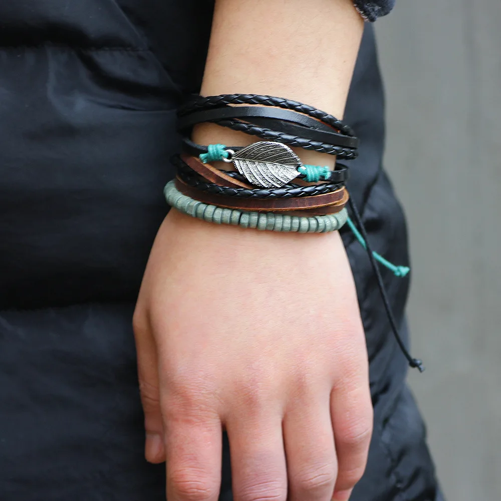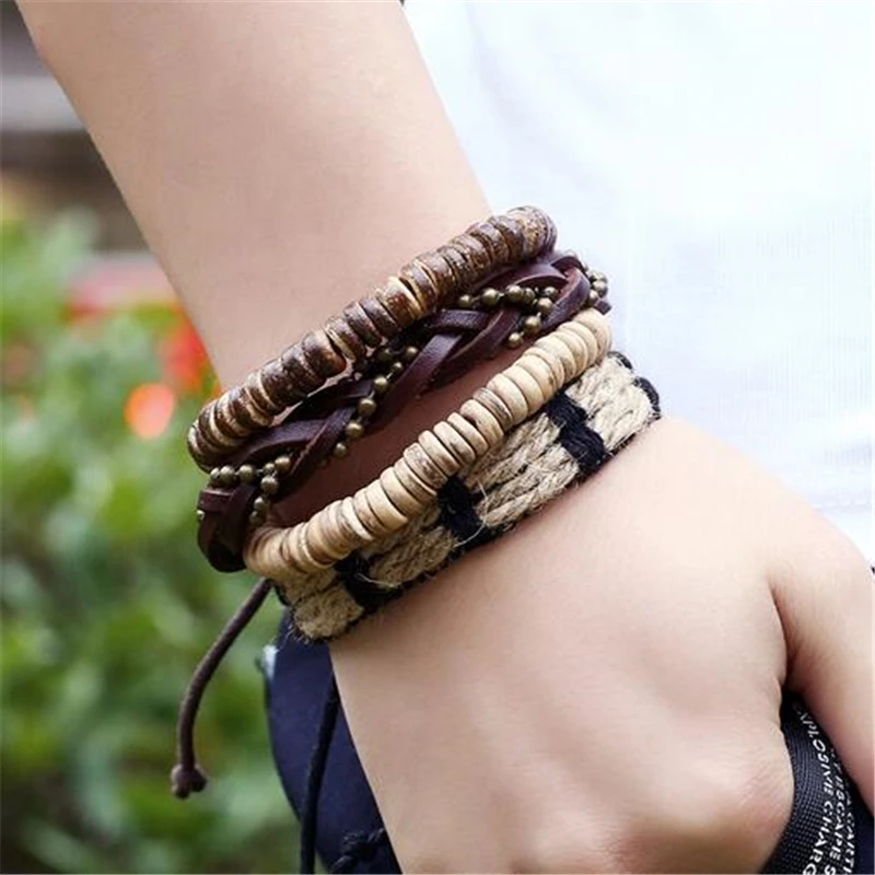 Винтажный Многослойный кожаный браслет в стиле панк, волнистый мужской модный плетеный веревочный браслет ручной работы, браслеты с деревянными бусинами, мужской подарок