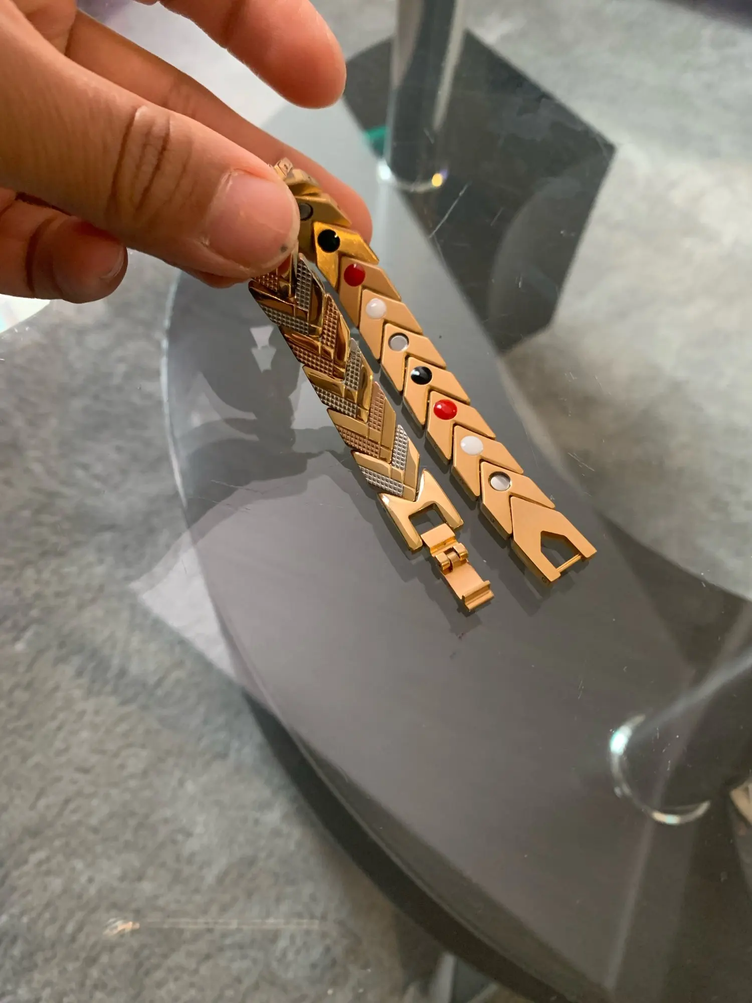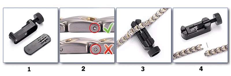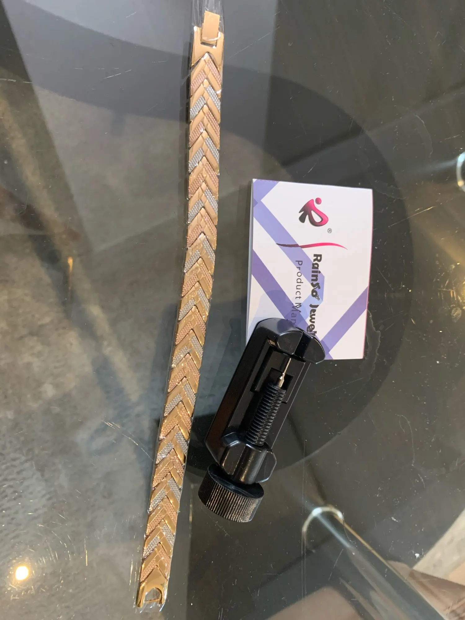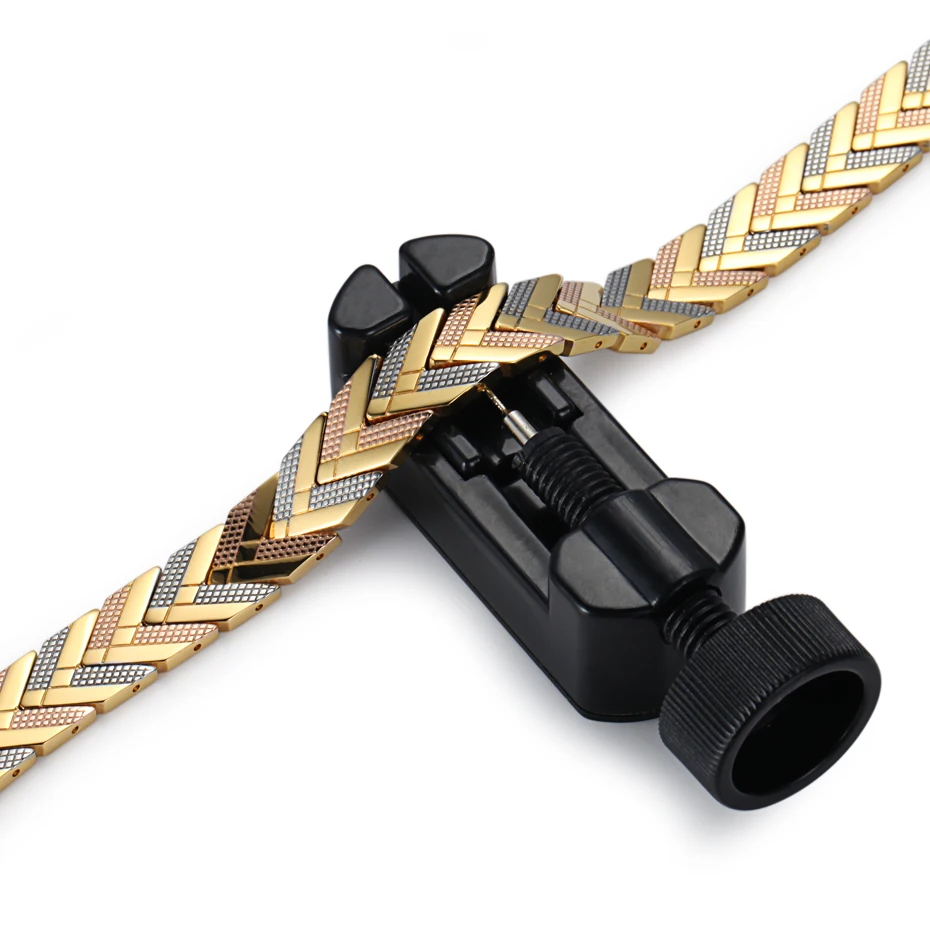 Браслет огромный. Машинку для удаления звеньев я заказывала вместе с другим браслетом. Она оказалась очень некачественной, все 3 иголки сразу сломались. Звенья я так и не сняла. Зато ожерелье развалилась само по себе, упало с шеи. Теперь у меня 2 огромных браслета и сломанное ожерелье. Разочарована, никому не советую.