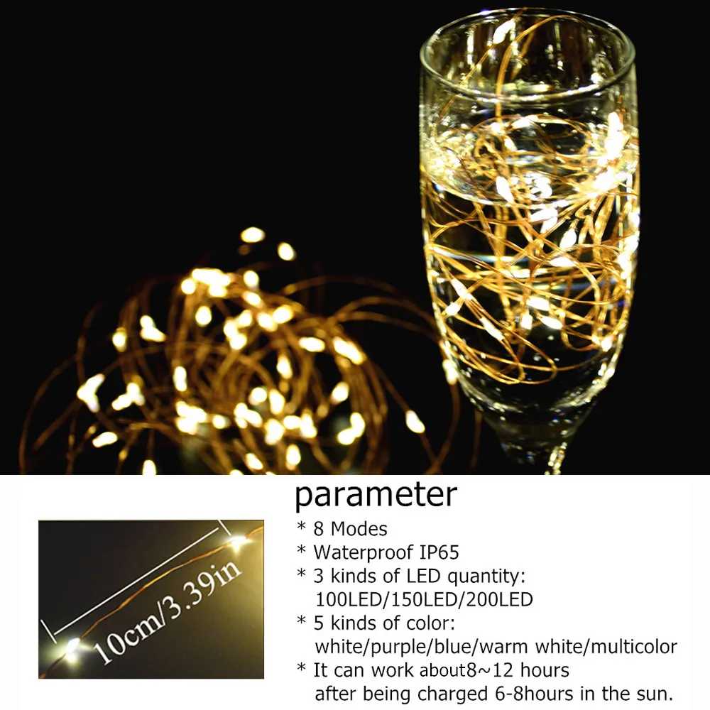 1. Материал: медная проволока2. Светодиодный: 100 светодиодный/150 светодиодный/200 светодиодный3. Цвет: белый/теплый белый/синий/цвет насыщенный/фиолетовый4. Режим: всего 8 modes.1 устойчивый/7 мигающий5. Время работы: может работать около 8 ~ 12 часов после зарядки 6-8 часов на солнце.