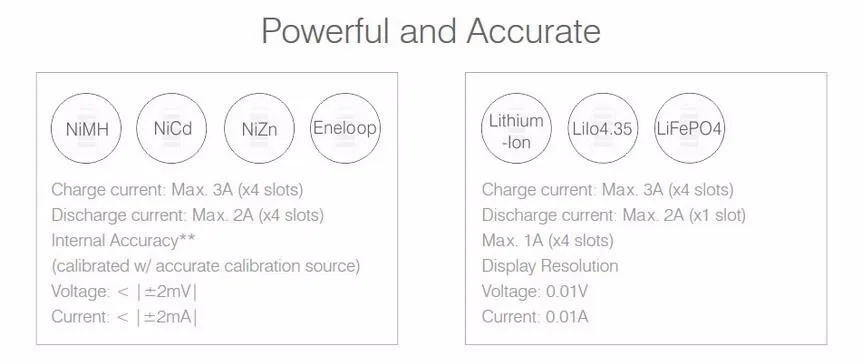 Замер напряжения точный, проверил чем мог - мультиметром за 2к руб. Аппарат достойный, куча настроек, программ для тех кому это надо. Li-ion заряжает по схеме cc/cv. Недостатки: приложение для андройд глючное. Считает как-то странно количество циклов зарядки-разрядки. Шло по почте 3 недели.