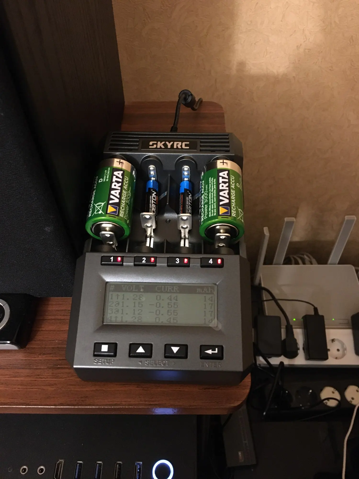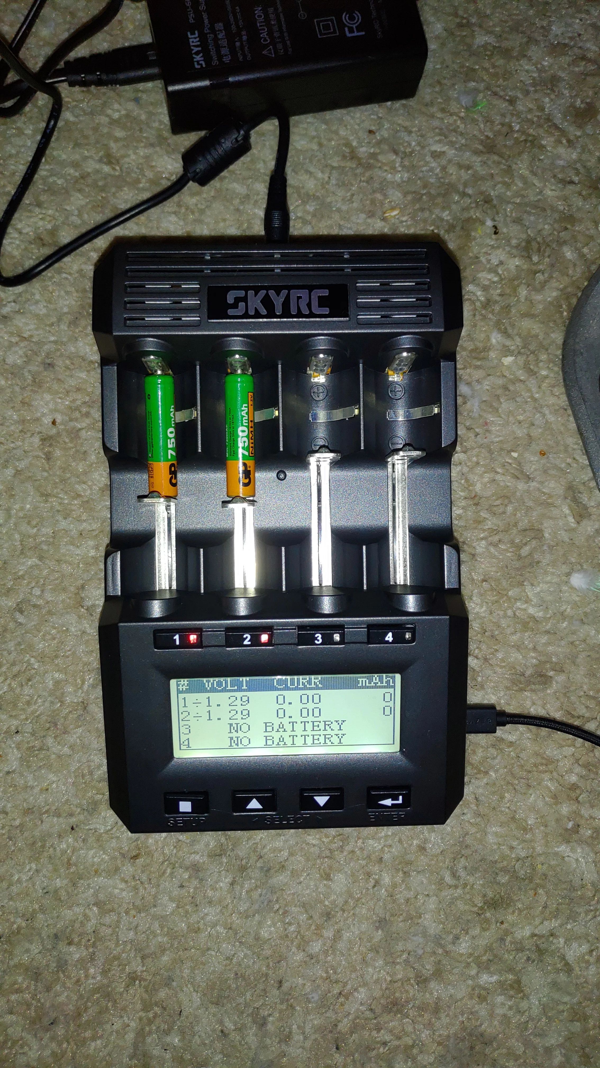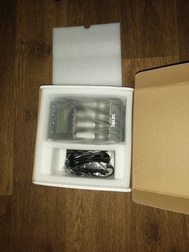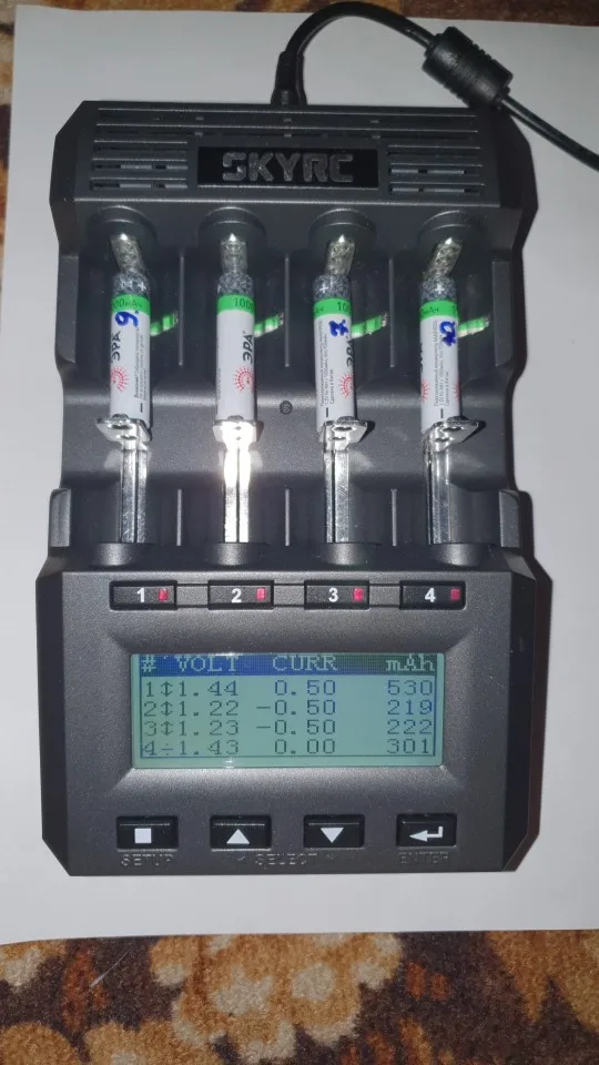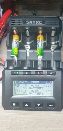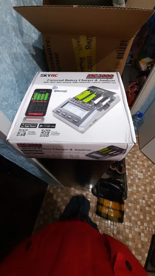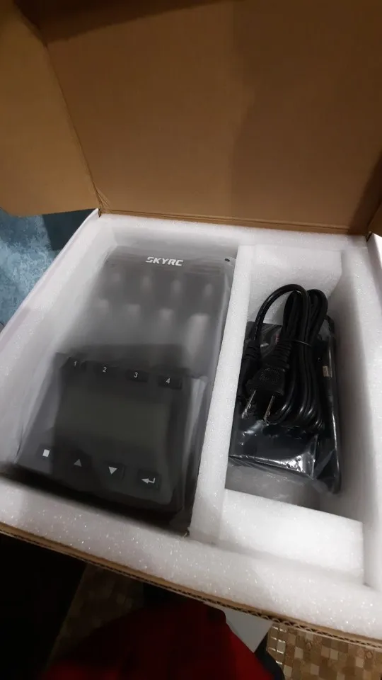 Коробка помятая (почему-то у skyrc всегда от их оборудования коробки помятые приходят в непонятных местах, как будто их так с завода мнут), но всё целое. Работает, заряжает. Наклеек нет, чтобы оригинальность проверить именно на этой модели, но думаю всё в порядке с ней. Размеры больше чем казалось на картинках. Здоровая штука)) AAA аккумы как-то неуверенно держатся, но это ладно. Прошивка и версия на фото. 2 вентилятора. Остальное тестировать надо. Посмотрим.
