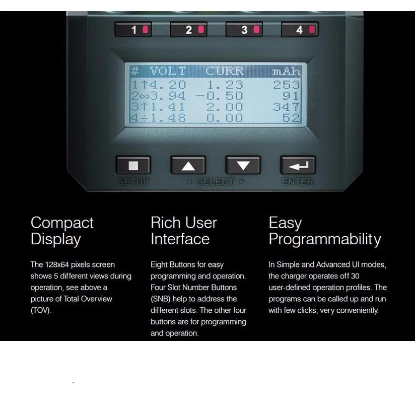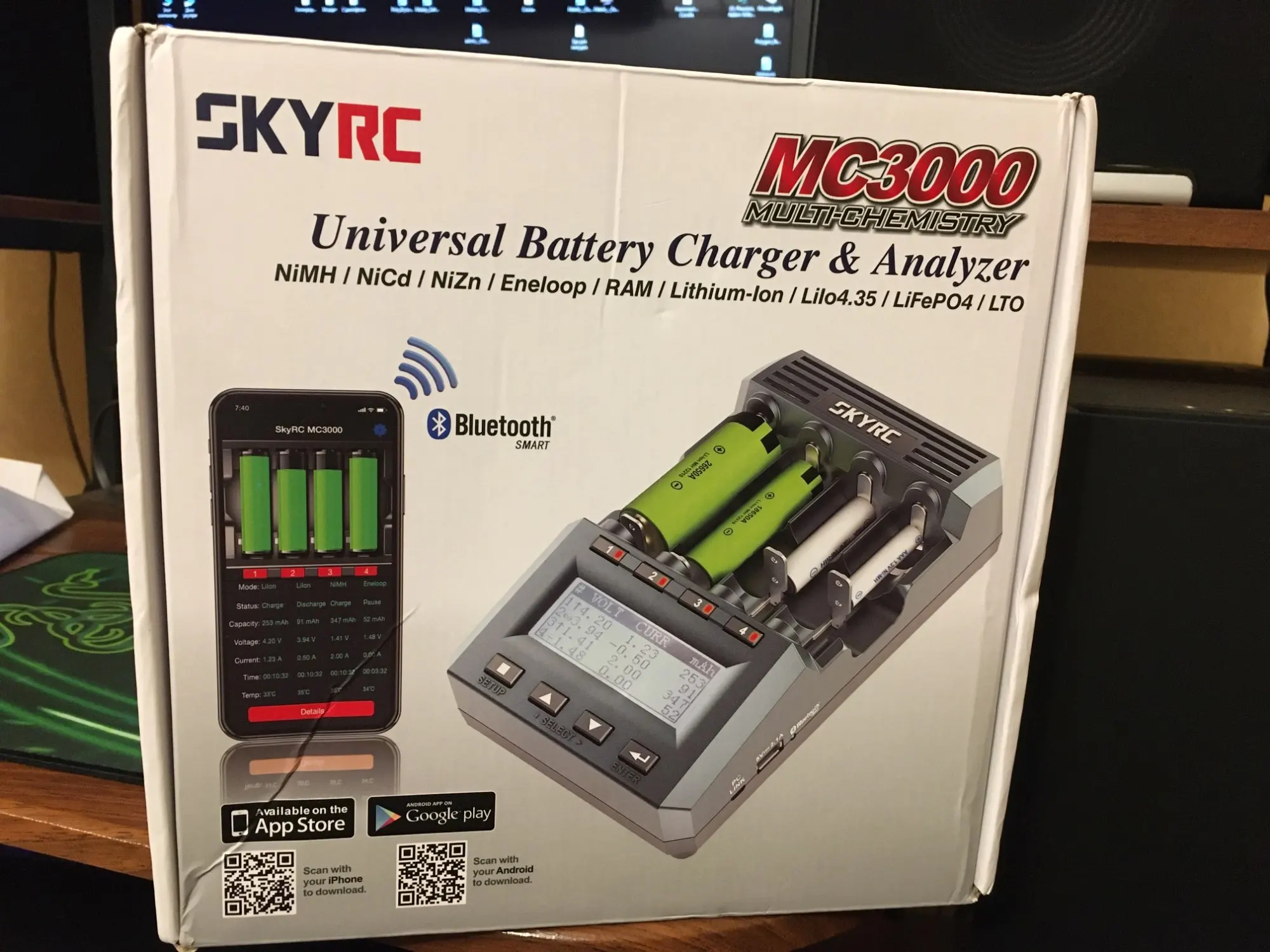 Зарядка навороченная. Многое может. Инструкции не было внутри коробки. Блютуз работает, но это баловство. К ПК подключается. Прижим батареи жестковат. Ещё наткнулся на Ютубе на видео, где показывают доработку четвёртого слота. Там при установке батареи на 700мм прижим упирается в ногу электролиту . У себя такой проблемы не заметил.