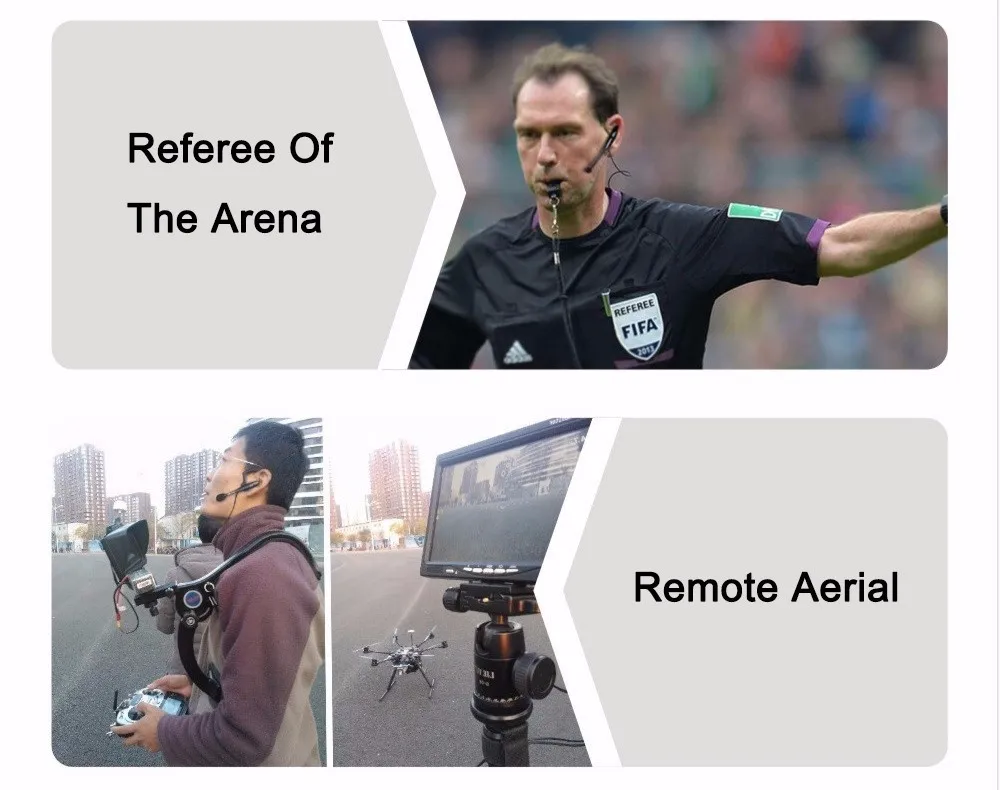 Рефери надевают гарнитура на одно ухо, чтобы получить новости в реальном времени игры, эта гарнитура поддерживает их, чтобы бегать свободно, но также слышать четкий звук, даже окружающие шумят.