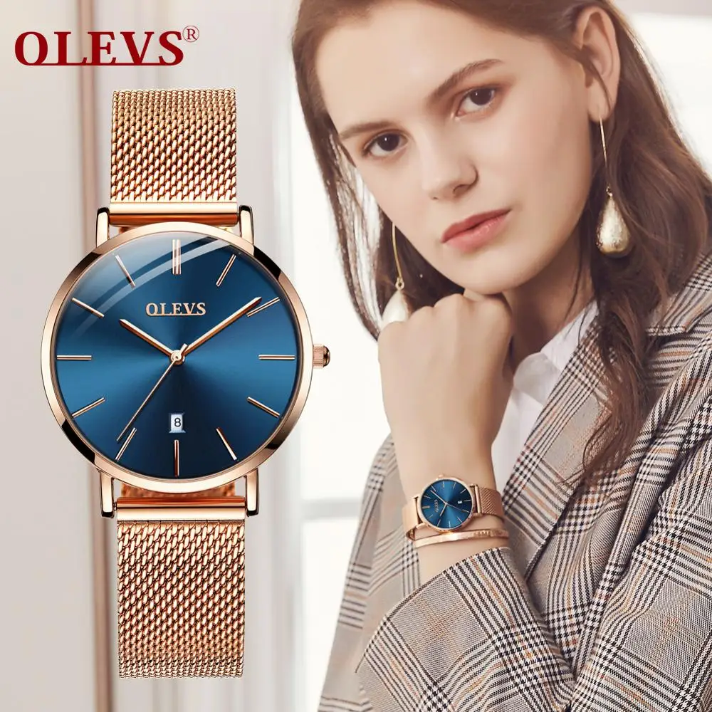 Женские кварцевые часы, ультратонкие, водонепроницаемые, из нержавеющей стали, под розовое золото, с календарем