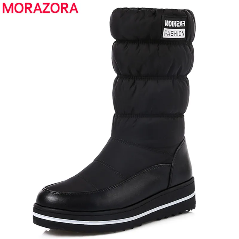 MORAZORAБольшие размеры 35-44, новые зимние ботинки женская теплая хлопковая пуховая обувь водонепроницаемые ботинки до середины икры на меху на платформе черного цвета