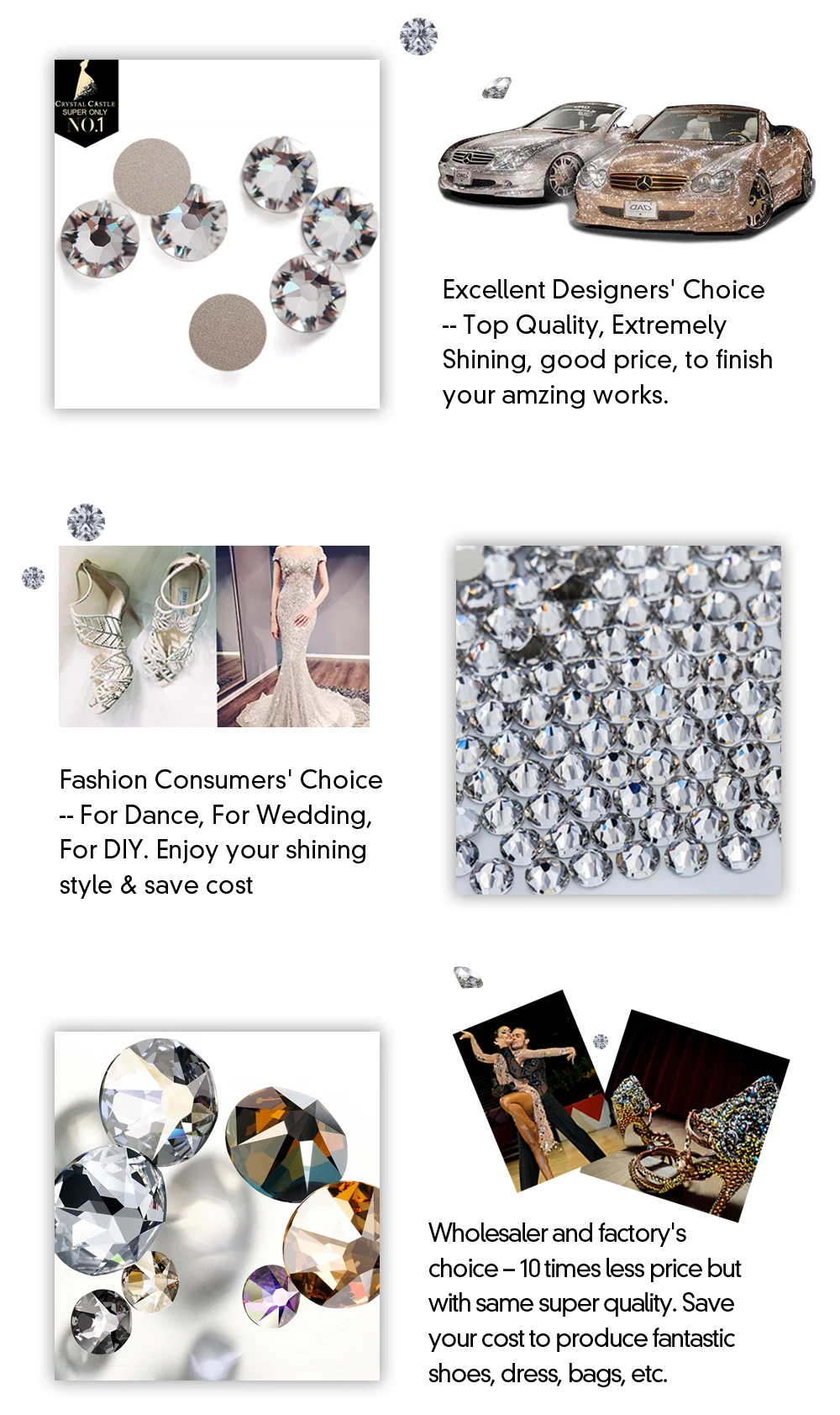 С украшением в виде кристаллов замок Industrial Co., Ltd является компанией, которая специализируется на Стразы продуктов, в том числе стразы с прямой основой, роскошным камнем, пришить, стразы сетки, цепь чашки, и другие все стразы продукты и соответствующие продукты. У нас есть собственная фабрика и продажи, которые экспортируют большое количество камней по всему миру. Мы можем предложить Вам различное качество с лучшей конкурентоспособной ценой согласно вашему рынку. Если у вас есть оптовый заказ, ваш запрос всегда приветствуется.