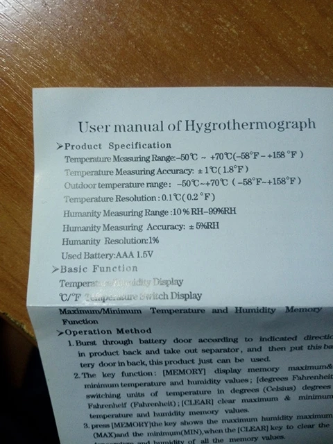 Пришол довольно быстро. Разброс между внешним и внутренним показаниями температуры от 0.4 до 1 градуса. Показания гигрометра сравнить пока не счем. Жду гигрометр другой модели. После сравнения опишу.