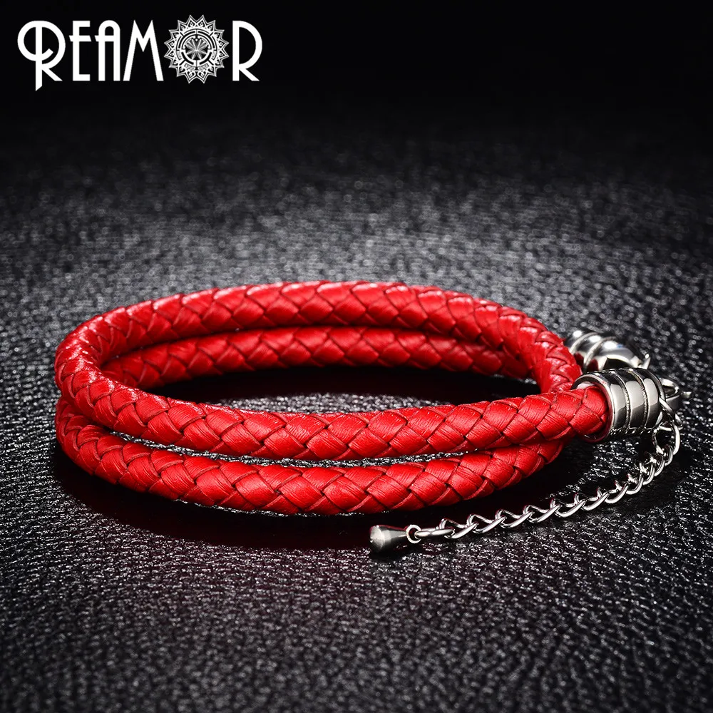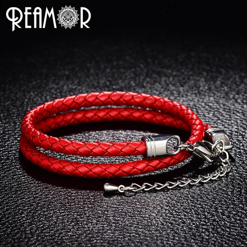 Женский двойной плетеный кожаный браслет REAMOR, простой красный браслет из нержавеющей стали 316L с длинной цепочкой 5 см, модные мужские украшения
