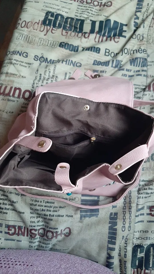 Сумка плотная, качественная, прошита хорошо, немного торчали нитки, но не критично. Внутри одно отделение на замке для мелочей, сбоку карман, влезает паспорт. Закрывается на магнитные кнопки, не очень удобная в использовании, зато красивая, цвет приятный розовый.