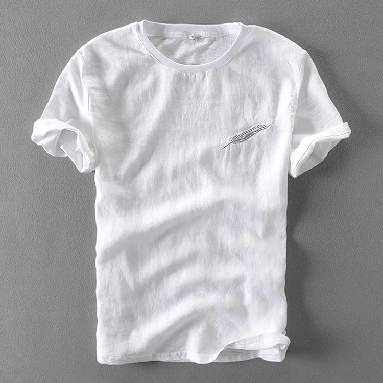 Летняя льняная футболка с коротким рукавом, мужская белая хлопковая Футболка с вышитым пером, брендовая модная мужская футболка, одноцветная Футболка camiseta