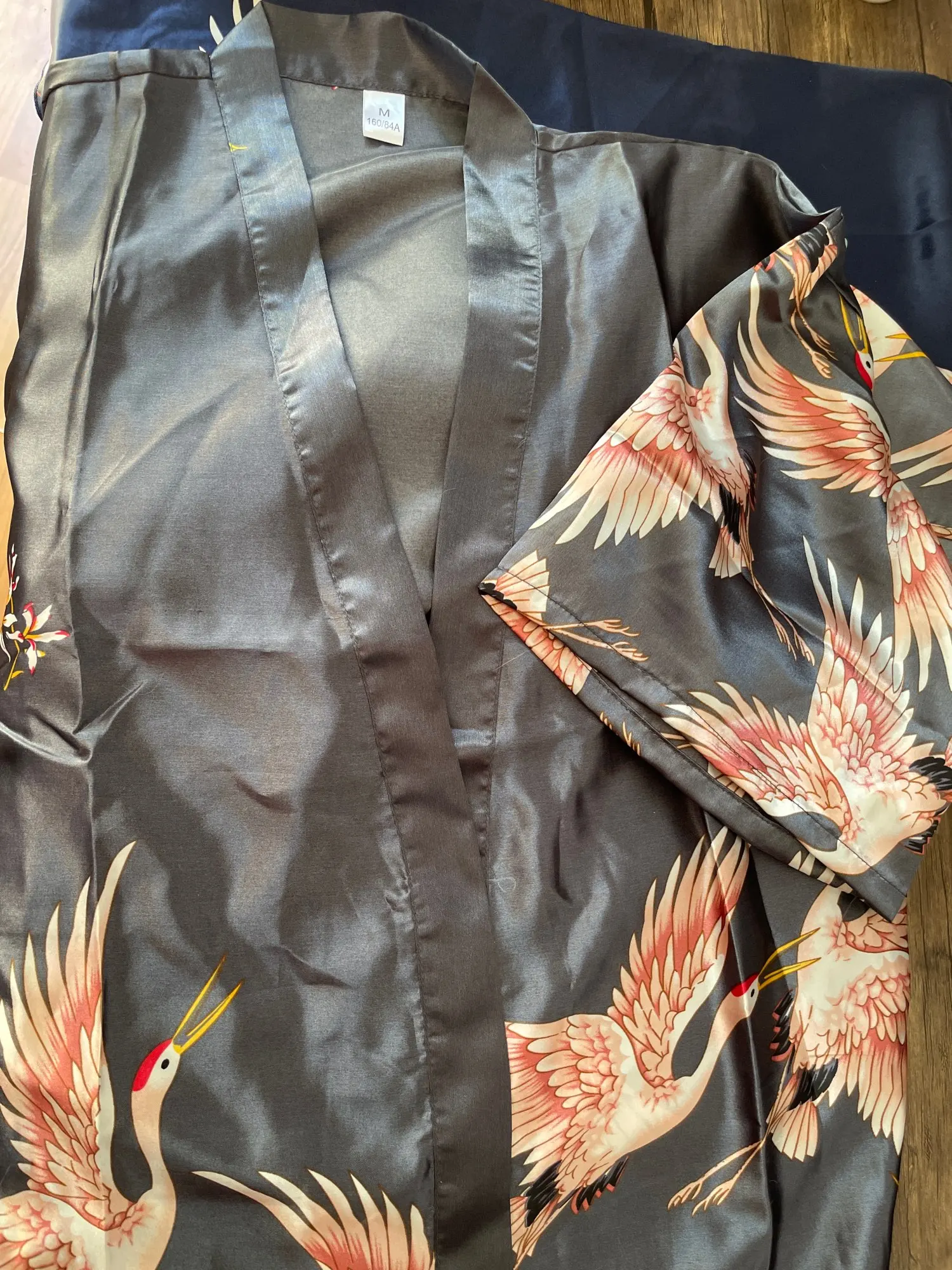 Шёлковый халатик, качество хорошее, цвет оказался темнее чем на фото) я ростом 164 см и сама по себе довольно миниатюрная, брала поэтому самый маленький размер, по длине оказался немного выше колен, что смотрится очень прилично) но в обхвате великоват конечно, смотрится немного мешковато, но в целом меня устраивает)