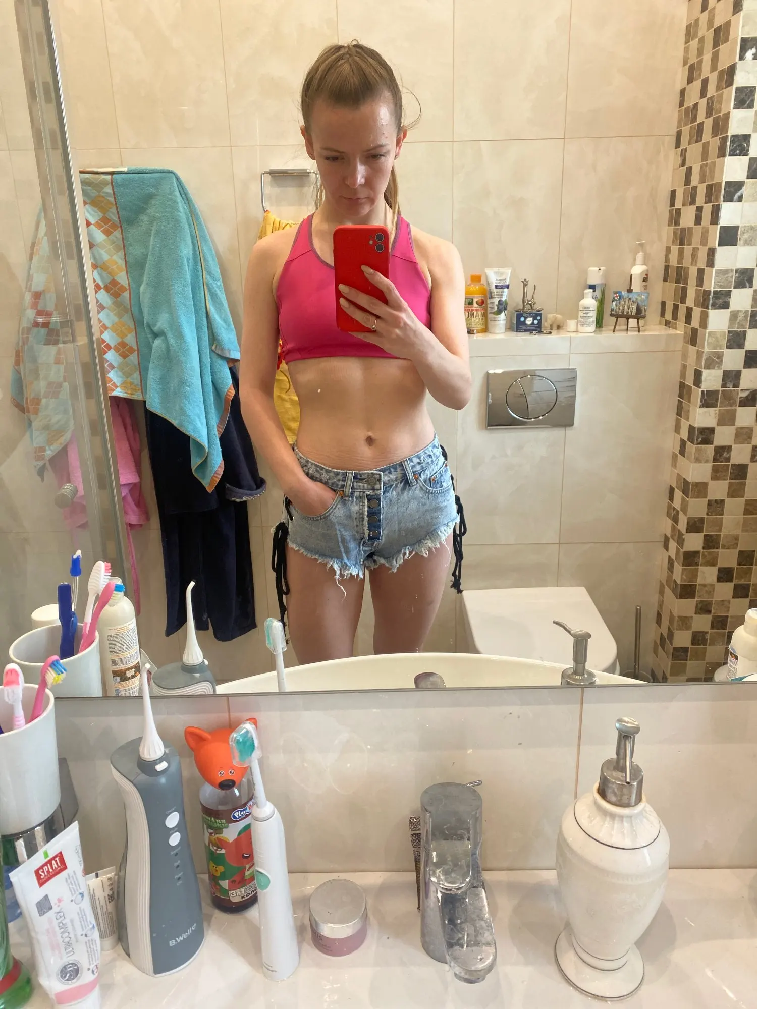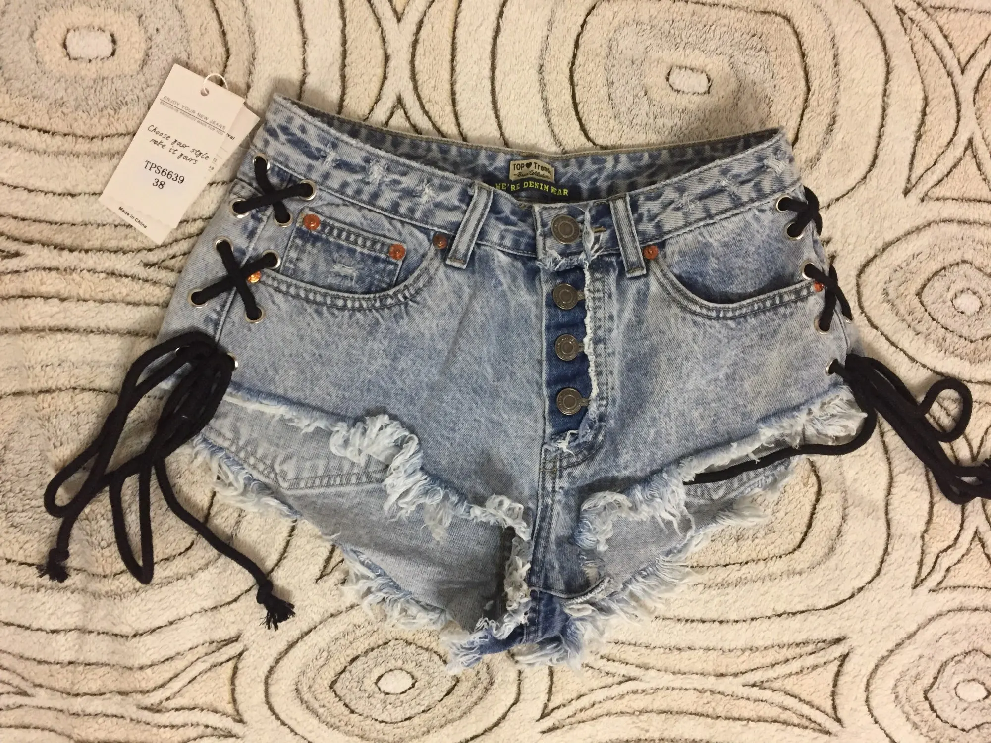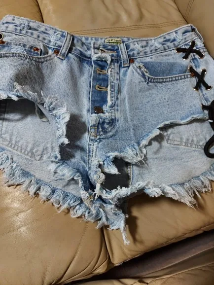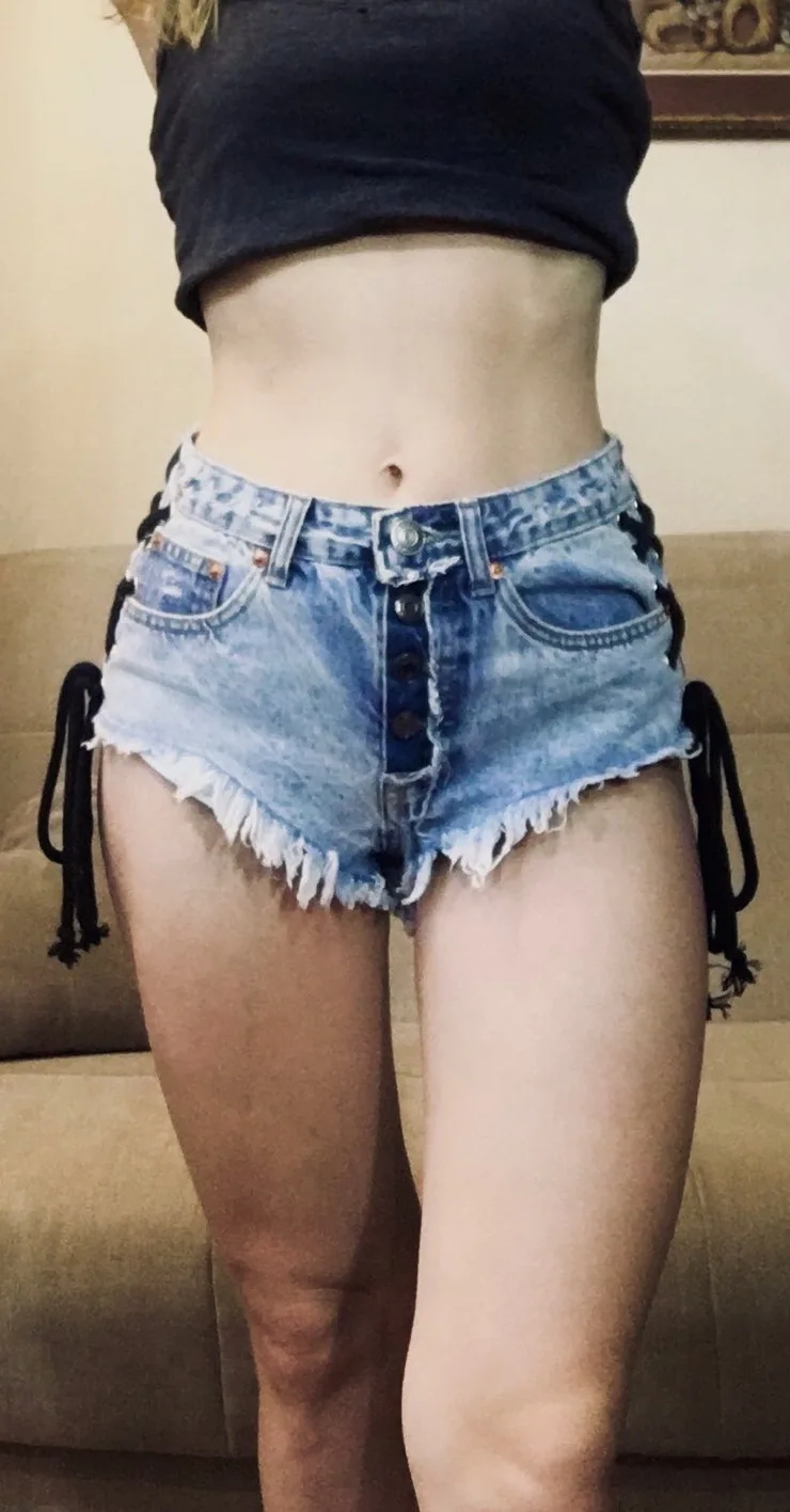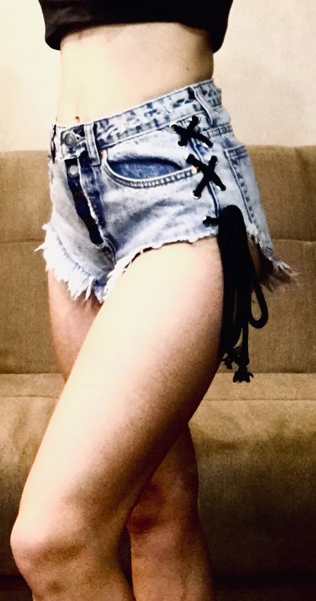 Шорты отличные! Размер 36 подошёл на бёдра 90 и талию 70, единственное что не очень нравится что выглядят как трусы спереди, если натянуть до пупка, то есть до талии, поэтому ушью на 1,5 см между ног чтобы посадка стала средняя и тогда сядут как на моих фото здесь. Джинс плотный, качественный, шнурки обрезала покороче, а то были длинные. Шорты очень нравятся несмотря на все эти детали. Спасибо!