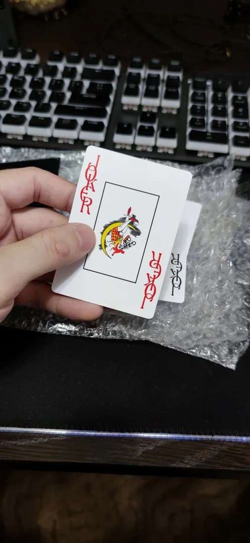 Посылка пришла быстро. 23 дня в Украину. 1 коробка слегка примята. Карты все целые. Подрезка только в одной колоде. Может так и надо? Не знаю. Логично было бы ложить в каждую. Очень скользкие. Принт красивый. Как износостойкость - игра покажет. Потестирую, напишу.