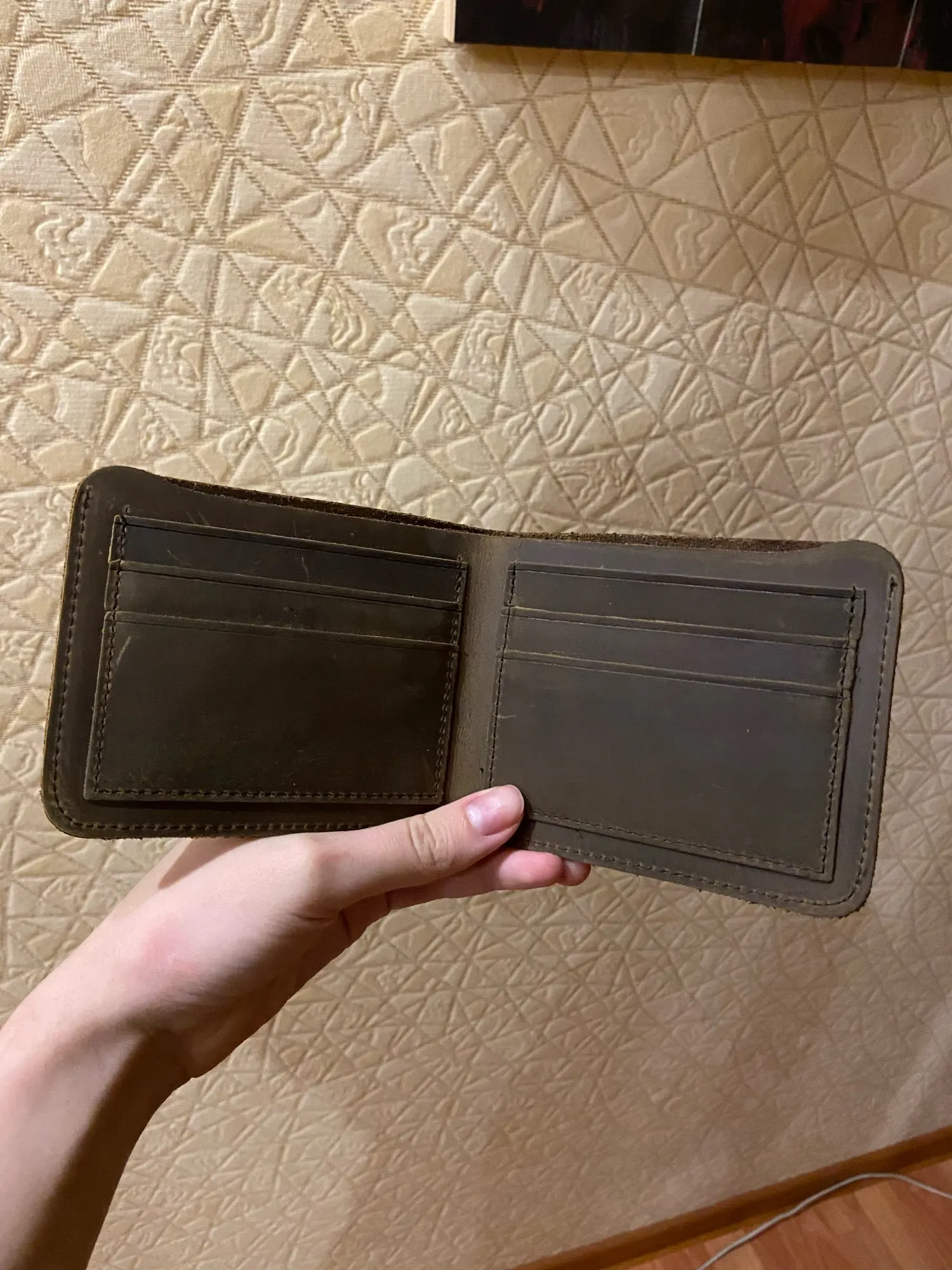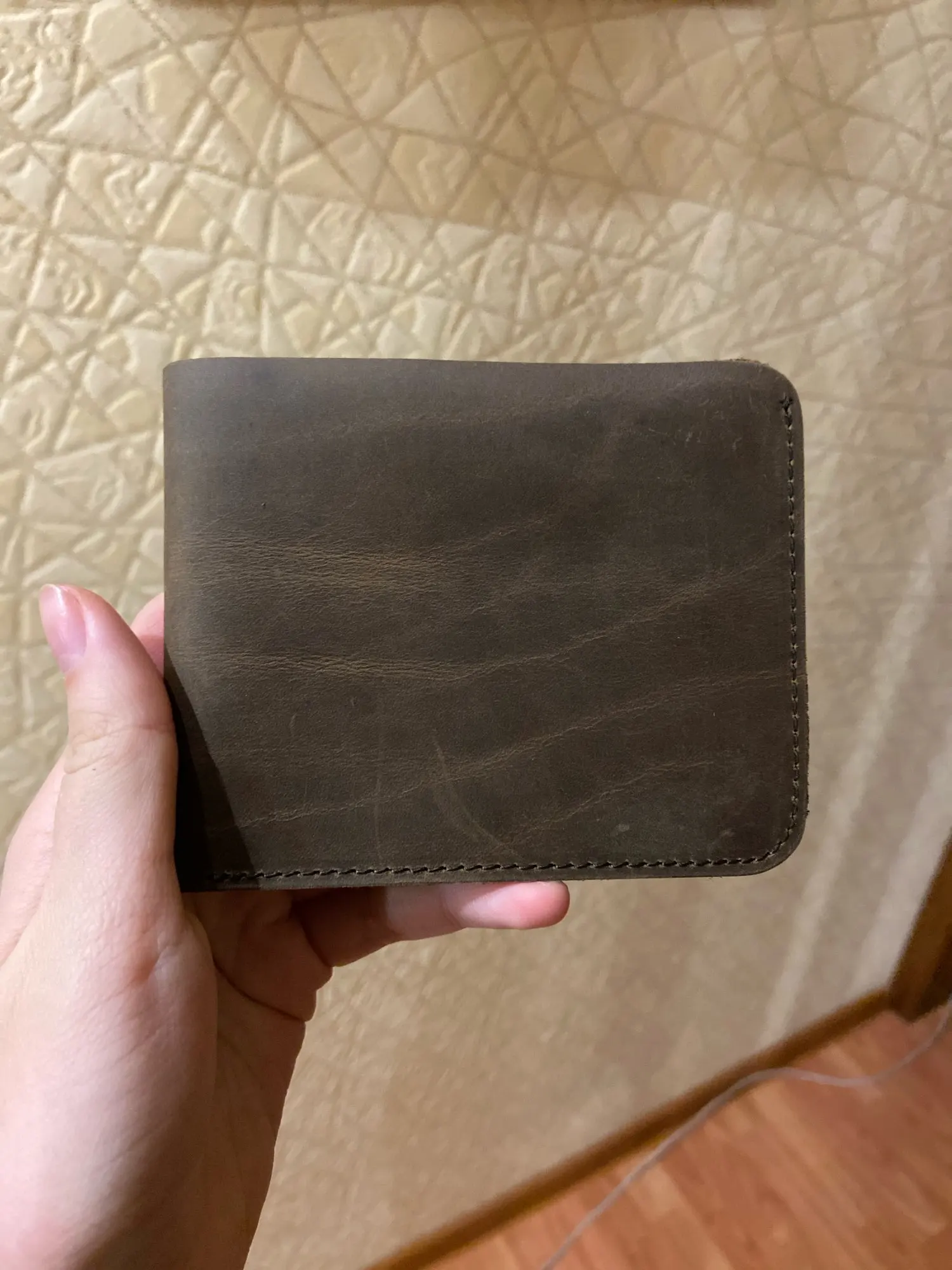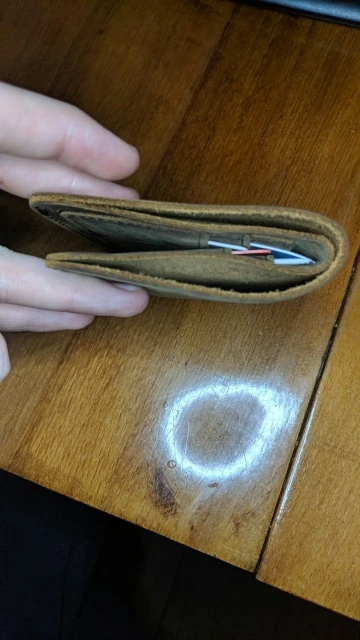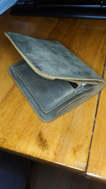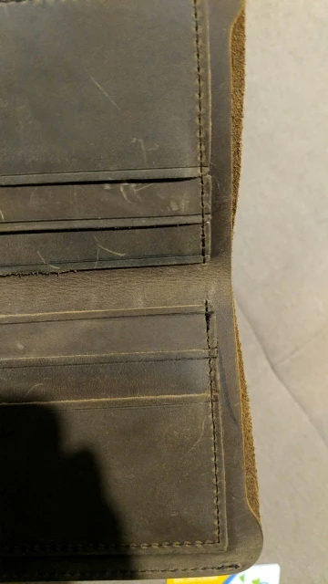 Внешне красив ибо прост. Даже грубоват на внешний вид. В принципе тот эффект что хотелось от этого кошеля, получен. На ощупь и внутряшка отделки ну прям кожа кожей. Запаха химозы не обнаружилось как от некоторых других заказанных предметов из кожи. Тест водой прошел с натяжкой. Палить огнем не стал, чтобы уж проверить наверняка. Наши деньги в нем тонут и в глубину и в ширину. В сравнении конечно, с другими кошельками, большой. Прошит аккуратно, не вручную, скорее всего машинкой. Дошло быстро. Видимо из Китая шло не пешком, а быстро быстро бежало))