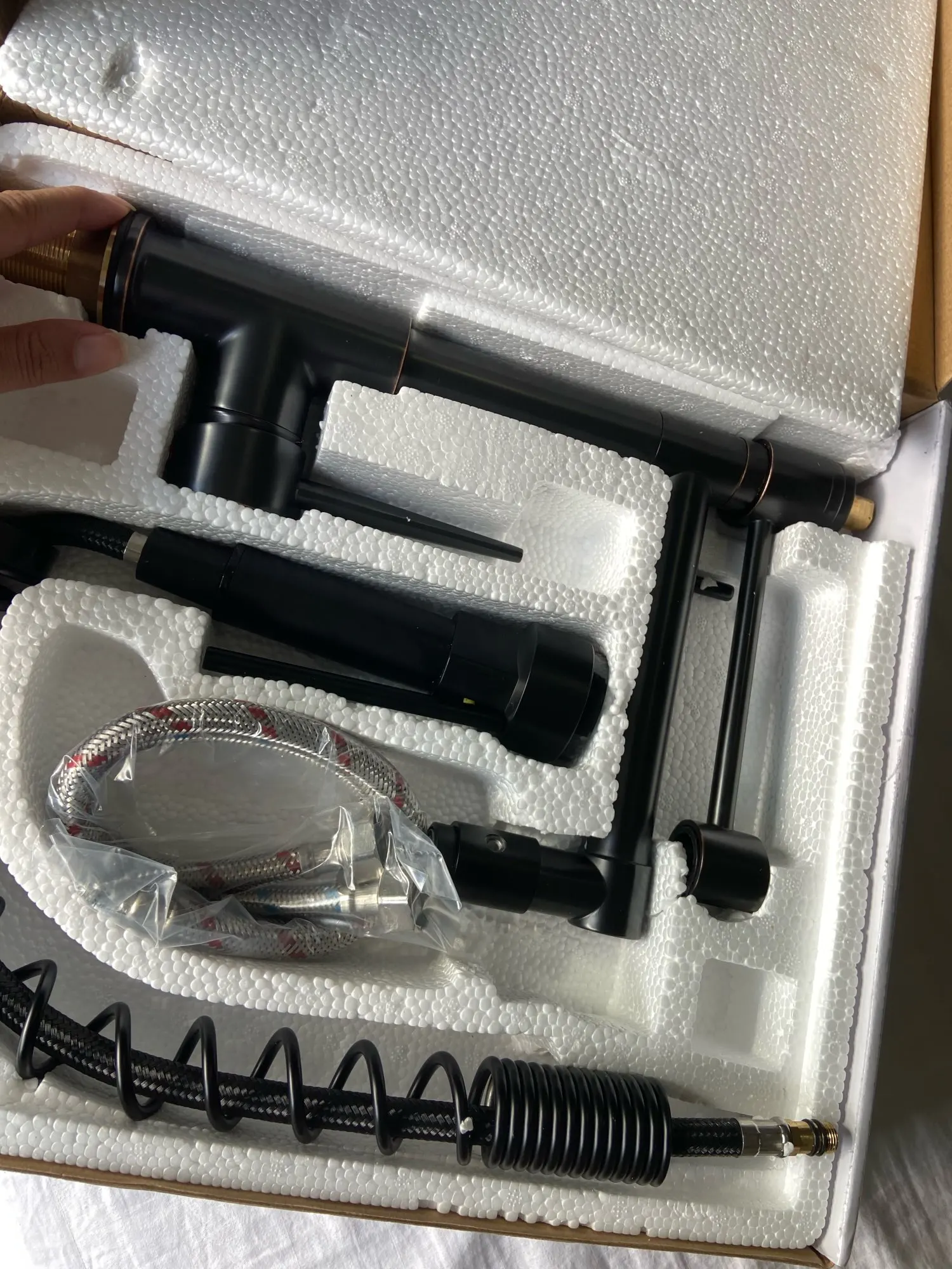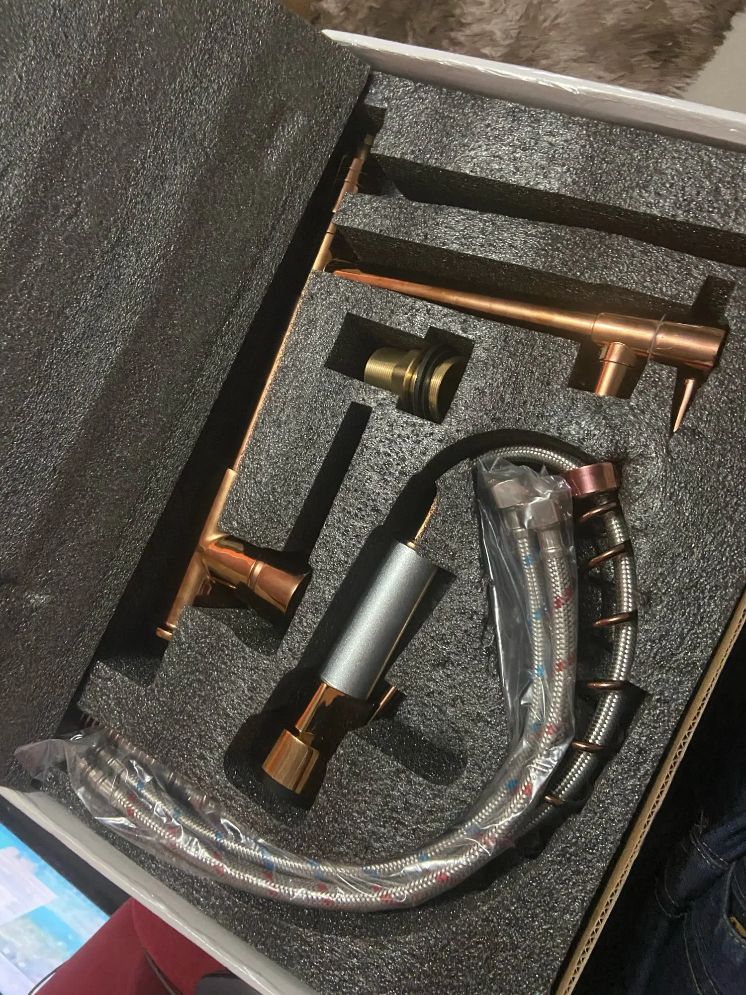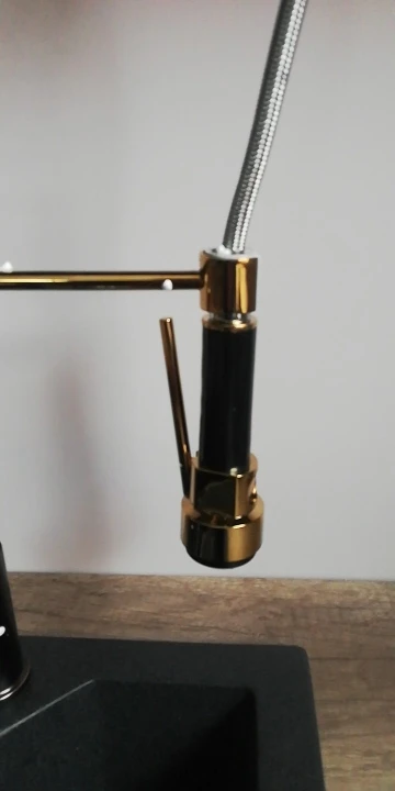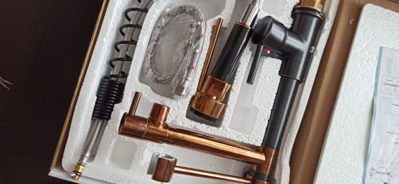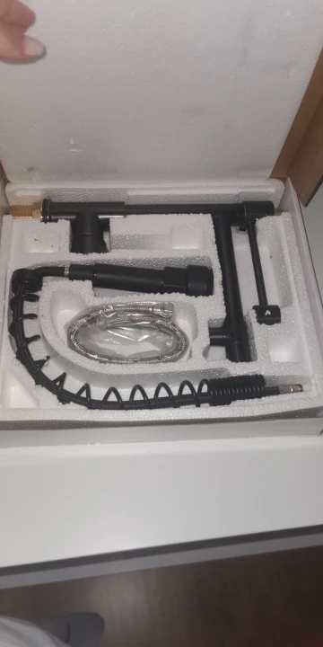 Смеситель на троечку. Очень много пластиковых элементов, пружина жесткая. Черный корпус не очень хорошо прокрашен, царапины как будто. Продавец отправил быстро заказ, прибыл тоже быстро курьерской службой до квартиры. Пальцем на фото указала, какие элементы выполнены из пластика.