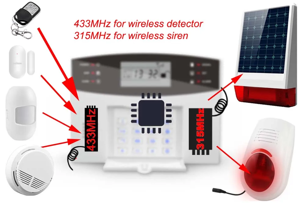 Частота 433 МГц для пульта дистанционного управления и беспроводного детектора, частота 315 МГц для беспроводной сирены.